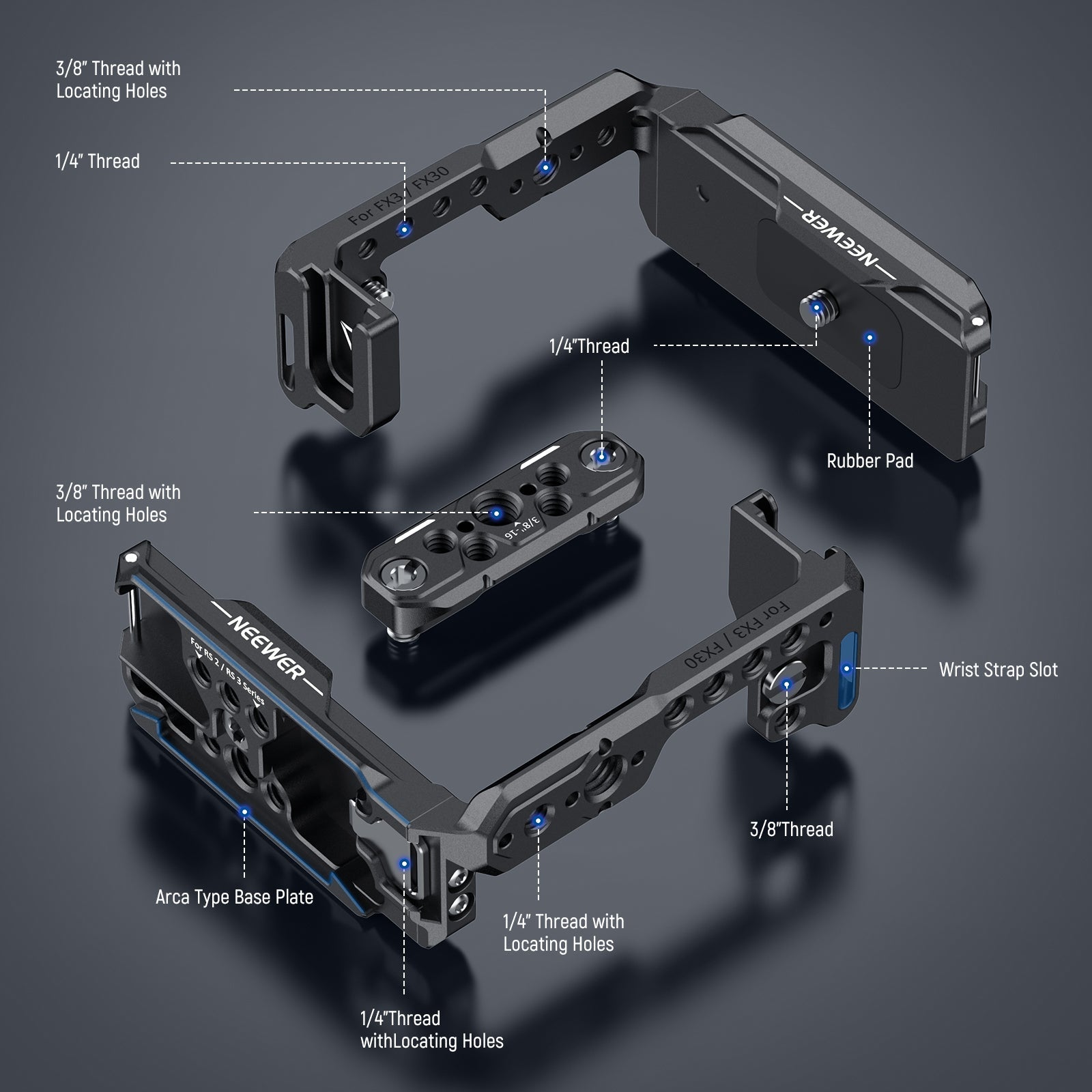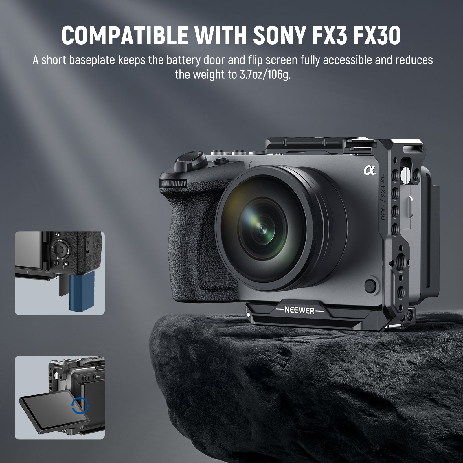 - Compatible with Sony FX3 FX30- Precise CNC machined aluminum alloy half camera cage weighs only 3.7oz/106g yet is highly durable. With a shorter baseplate design that omits the battery compartment, it maintains a slim and formfitting profile. It also keeps buttons, ports, and the screen fully accessible. Compatible with Sony XLR-H1 original XLR Top Handle Unit