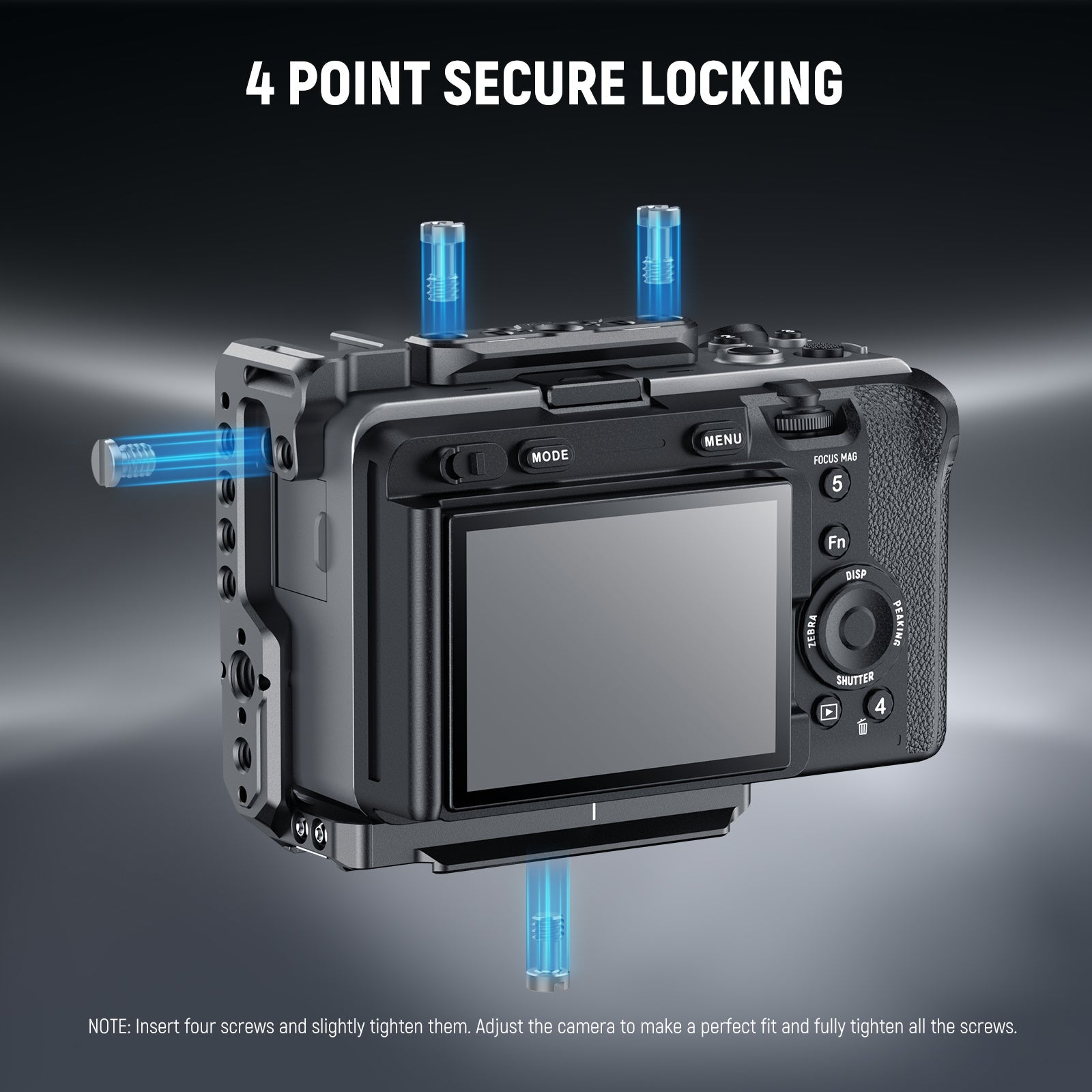 - 4-Point Secure Locking- The camera is secured with 4 screws, and a raised edge prevents deflection and shaky video footage. A nonslip rubber pad can protect the camera from scratches, and a screwdriver attached under the cage helps you tighten the screws with ease. (please put all screws in place without tightening them completely. Then, tighten them evenly for proper alignment and secure fastening)