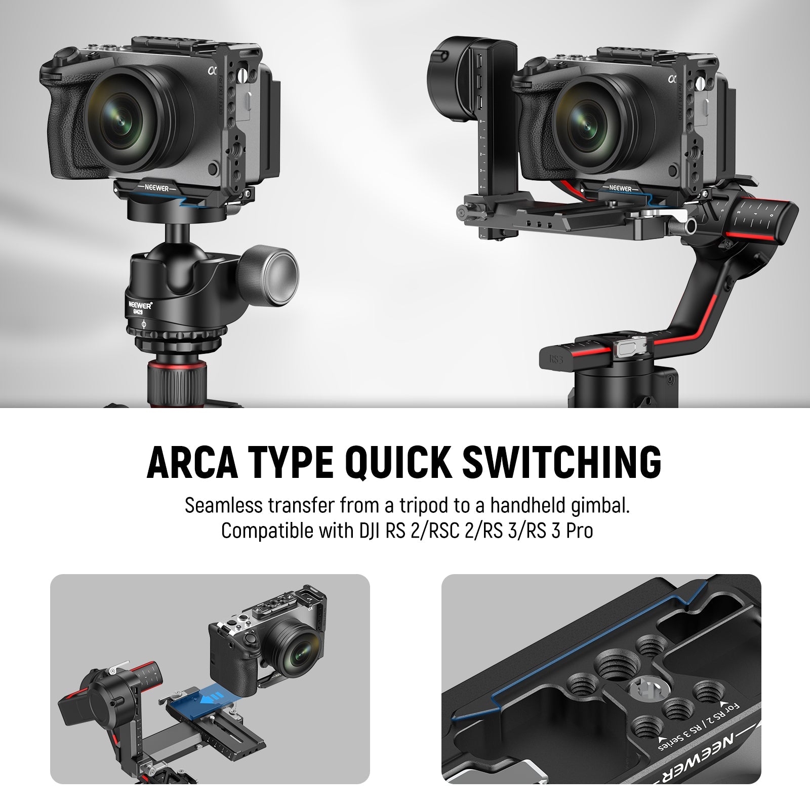 - Arca Type Quick Switching- The baseplate with anti drop anchored design is compatible with DJI RS 2 RSC 2 RS 3 RS 3 Pro gimbals and any Arca type tripod head, allowing you to smoothly slide the camera into a tripod or a handheld gimbal stabilizer for different video styles. It can directly mount on the gimbals without removing the quick release baseplate, saving you valuable time