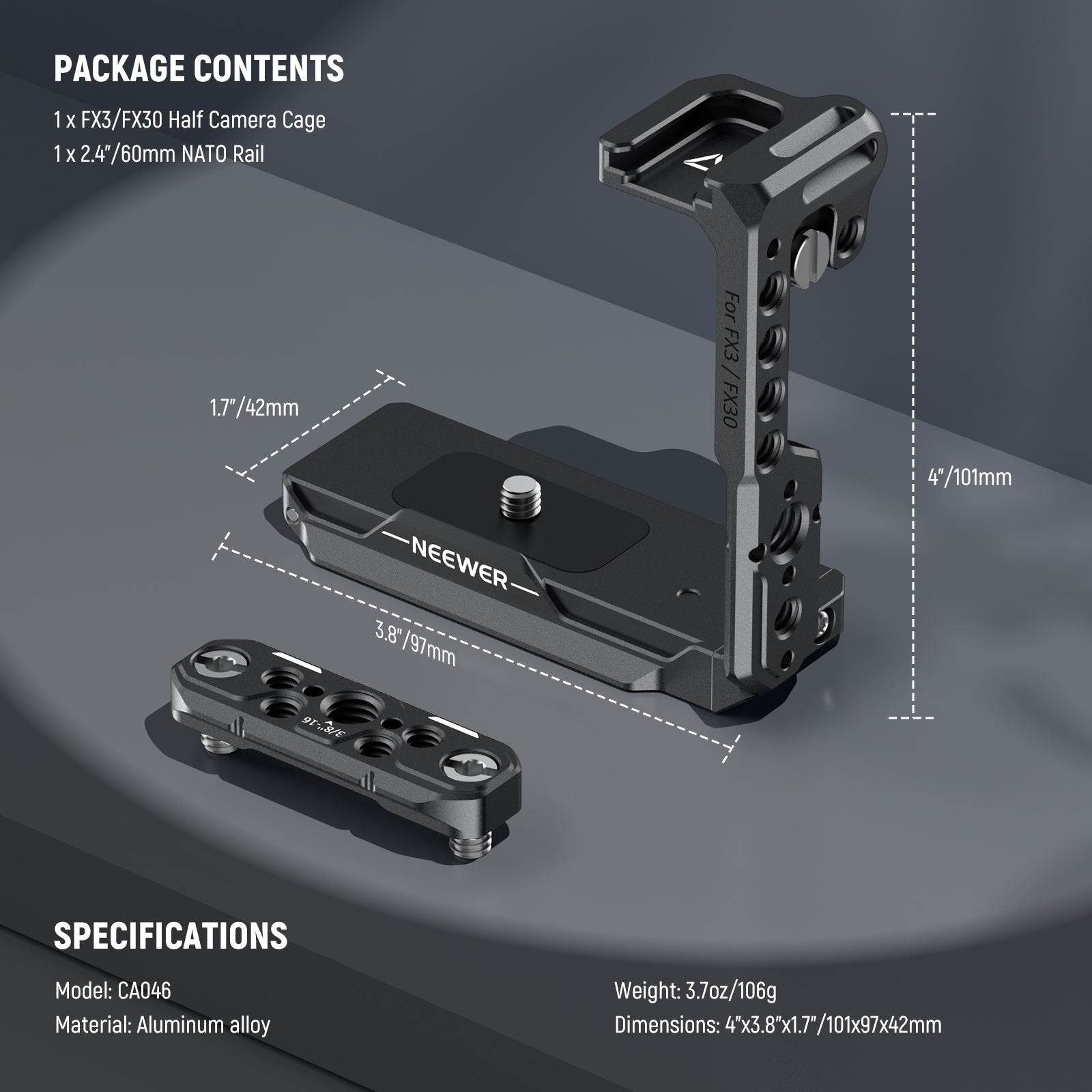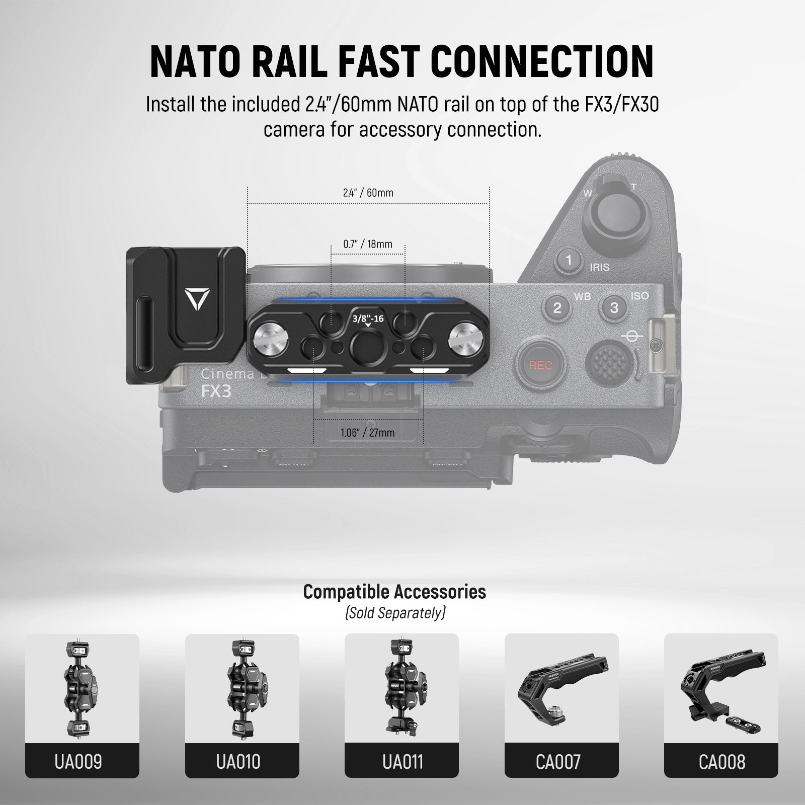 - NATO Rail Fast Connection- The included external 2.4" (60mm) NATO rail can be installed on the top of the FX3/FX30 camera body for mounting a series of NEEWER accessories, including PG005/CA008/CA018 Top Handles, MA005 Monitor Mount, UA011 Magic Arm, and more. A built in side NATO rail for CA017H side handle grip, compatible with SmallRig top handle side handle and other NATO type accessories