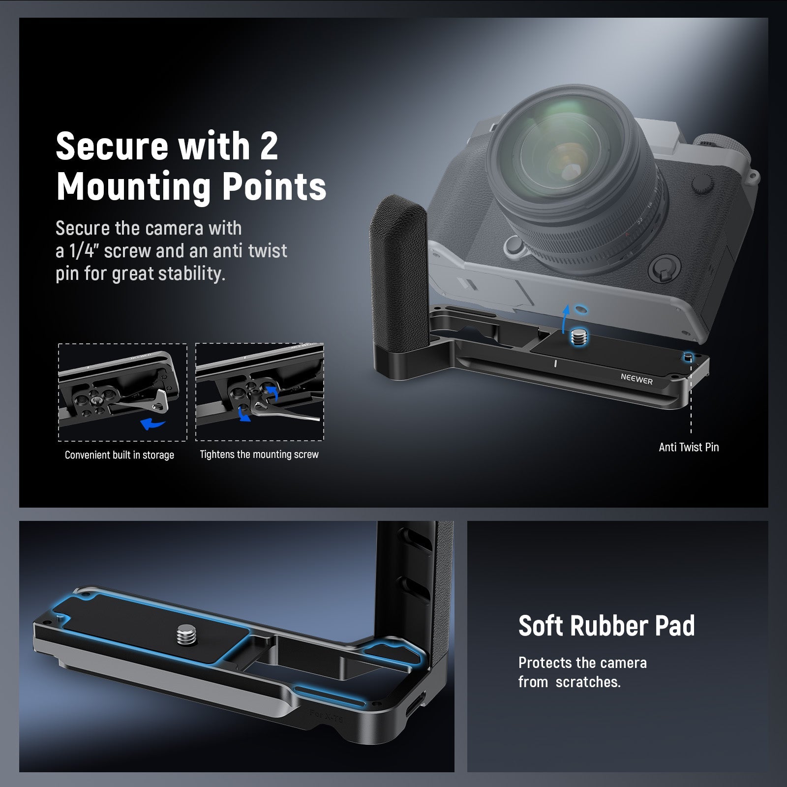 - Simple & Secure Attachment- The L bracket attaches to the camera through a 1/4" screw with several rubber pads to protect against scratches. A locating pin effectively prevents the camera from twisting, and a magnetic screwdriver makes attaching and removing the bracket a breeze