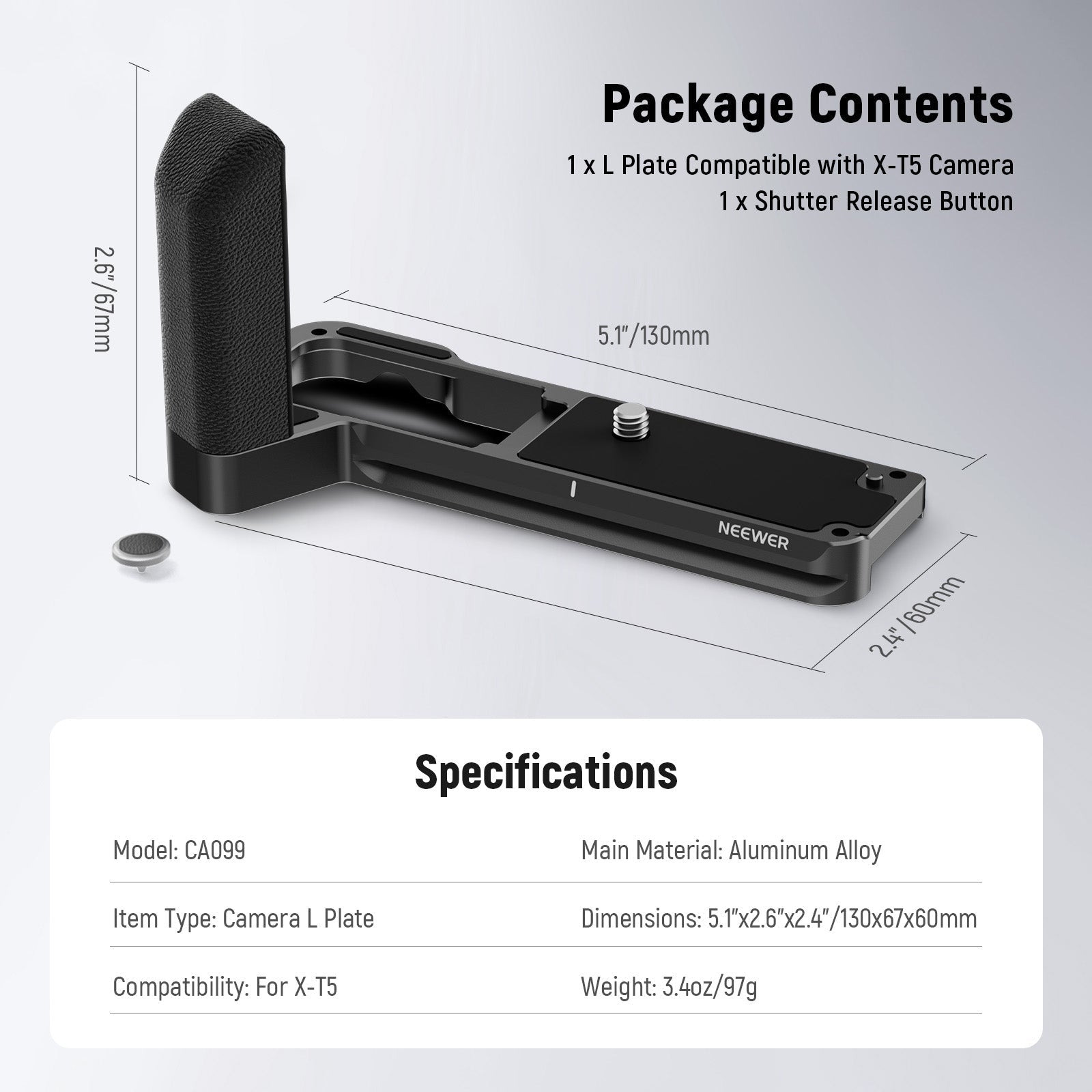 - Compatible with Fujifilm X-T5- Compatible with Fujifilm X-T5 camera, this formfitting L plate ensures full access to all camera functions and weighs only 3.4oz (97g) to keep the camera portable. The nonslip silicone grip brings comfort for handheld shooting, and the shutter cap enhances the feeling every time you press the shutter button