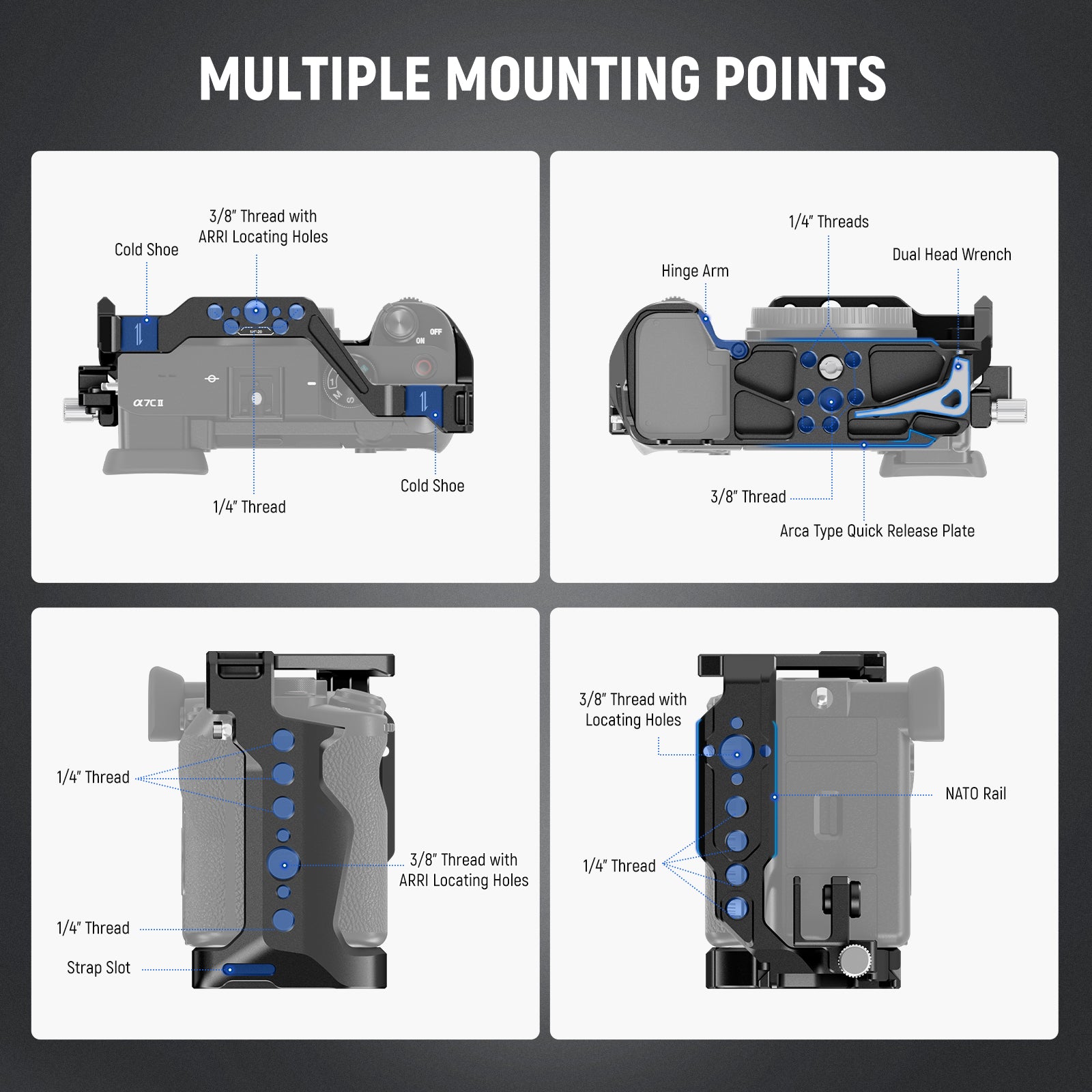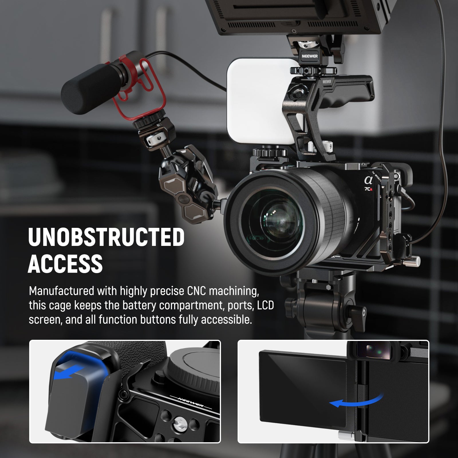 • All in One Full Cage Kit for Alpha 7C II & Alpha 7CR- Fully compatible with Sony Alpha 7C II and Alpha 7CR cameras, this formfitting cage ensures full access to the buttons, ports, articulated LCD screen, battery compartment, and keeps the hot shoe unobstructed for mounting microphones or speedlites. Made of CNC machined aluminum alloy, this durable yet lightweight cage can protect the camera from scratches and bumps