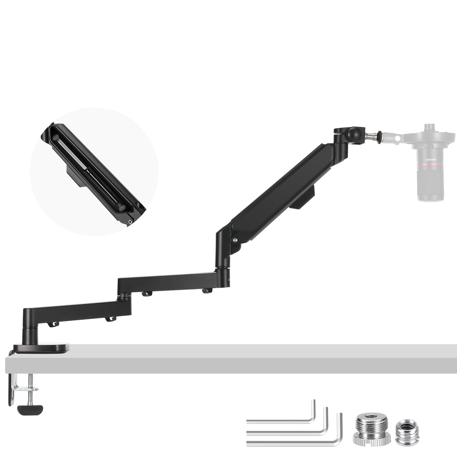 - Extended Reach & Flexible Adjustment- Upgraded with a two section bottom bracket and spring loaded top arm, it extends horizontally to 30.2"/76.8cm and vertically to 11.9"/30cm. Also with damping adjustment threads at each joint, you can tailor for desired tension (cannot be fully locked) using the included hex keys, and enables 360° pan for the bottom bracket and even a 360° swirl and 160° tilt for the microphone mounted on top