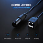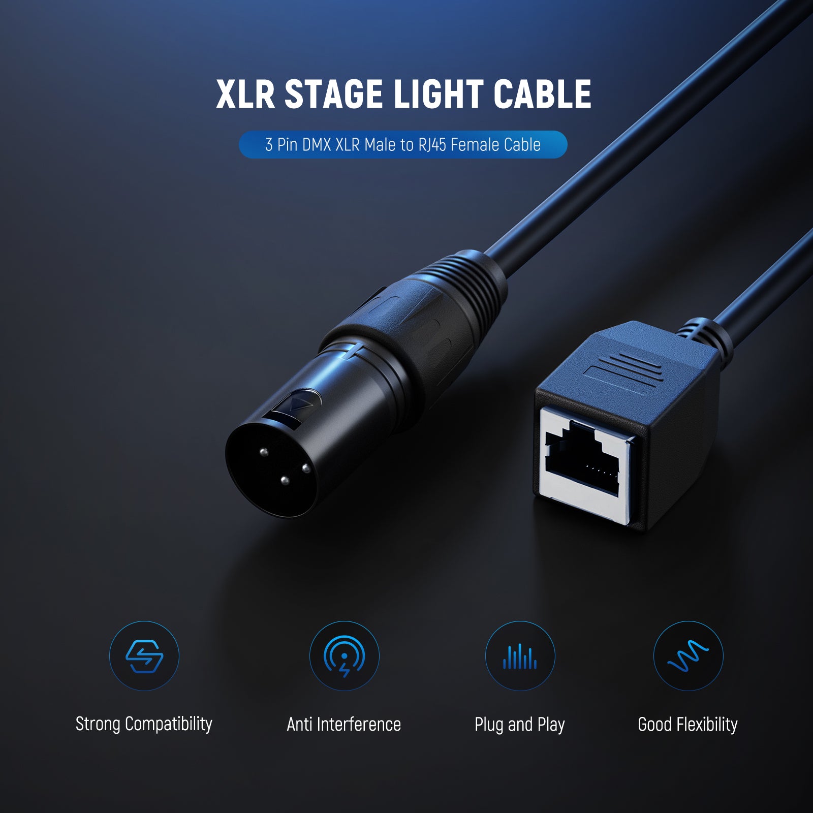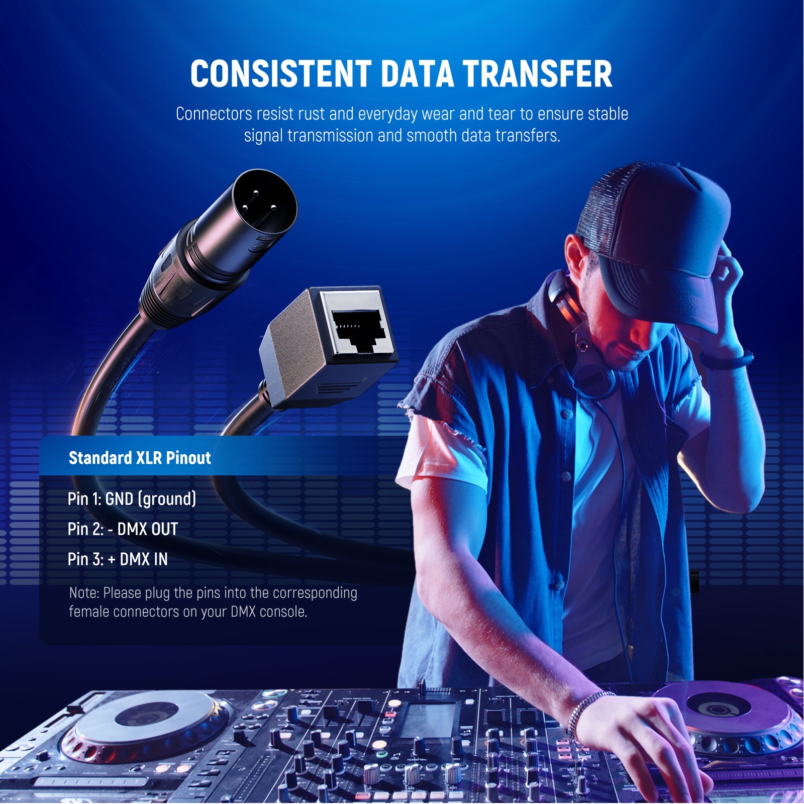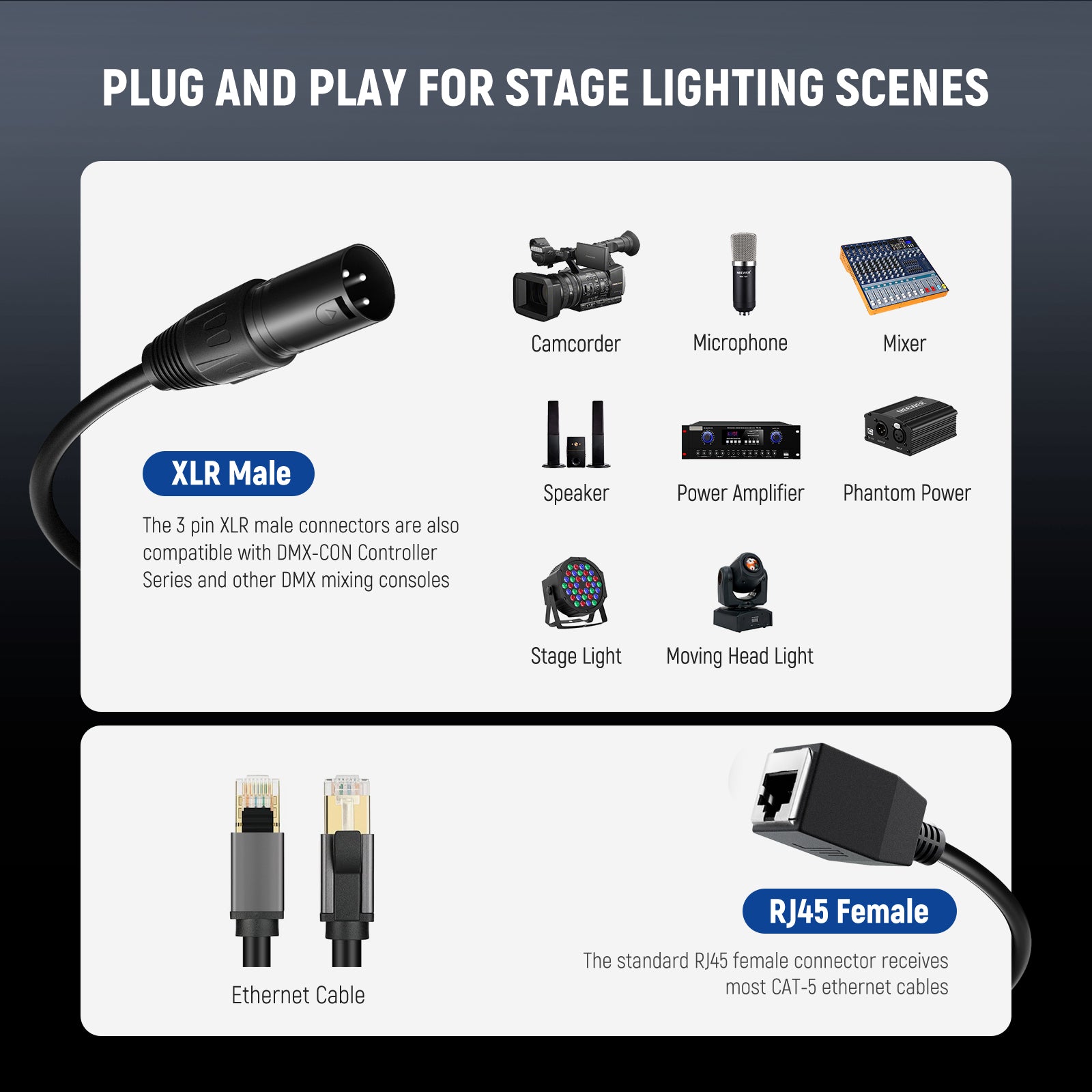 - Plug and Play for Stage Lighting Scenes- The 3 pin XLR male connectors are also compatible with DMX-CON Controller Series and other DMX mixing consoles for recording studios, concert venues, amplifiers, bands, live events, and any other professional interactive lighting scenes. The standard RJ45 female connector receives most CAT-5 ethernet cables