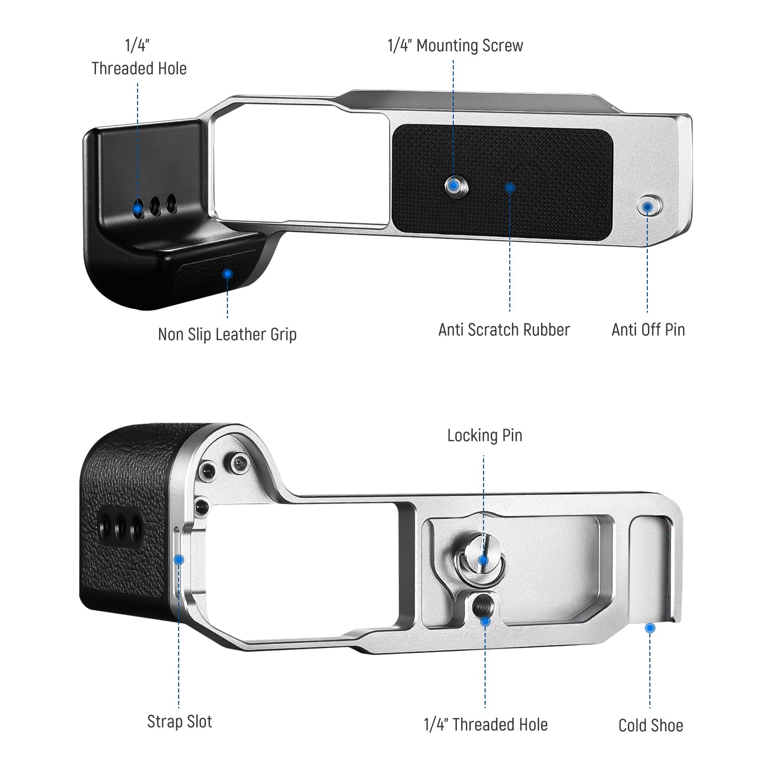 - Easy Accessory Attachment- Incorporating a cold shoe mount and three 1/4” threaded holes, the camera grip allows you to connect a LED video light, a microphone, or a field monitor for enhanced video and photography quality