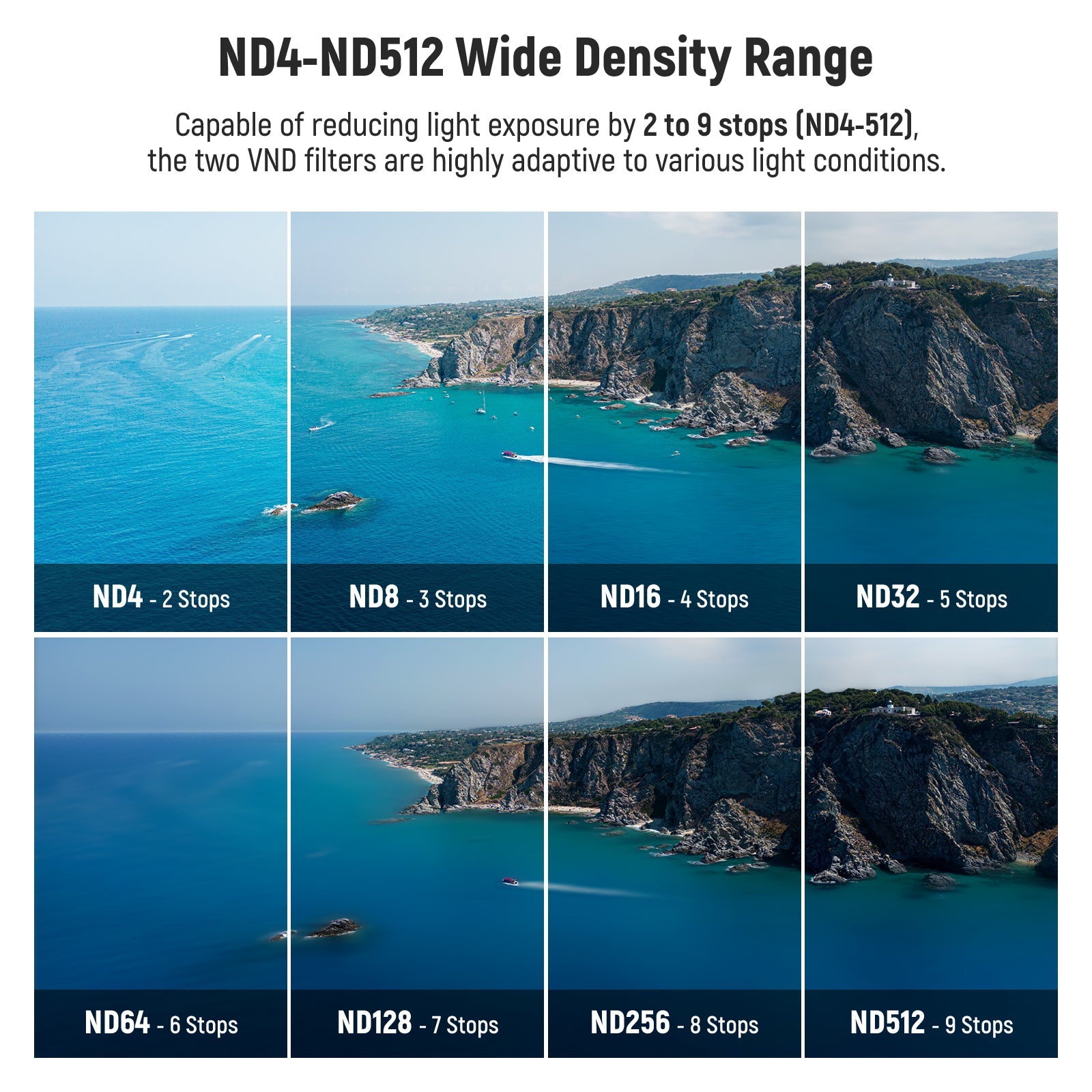 - Limited Variable Neutral Density Filter- Two variable neutral density drone lens filters: 2-5 stops light reduction VND (ND4-32) and 6-9 stops light reduction VND (ND64-512). This wider density range enables easy exposure handling under various light conditions for drone aerial filming