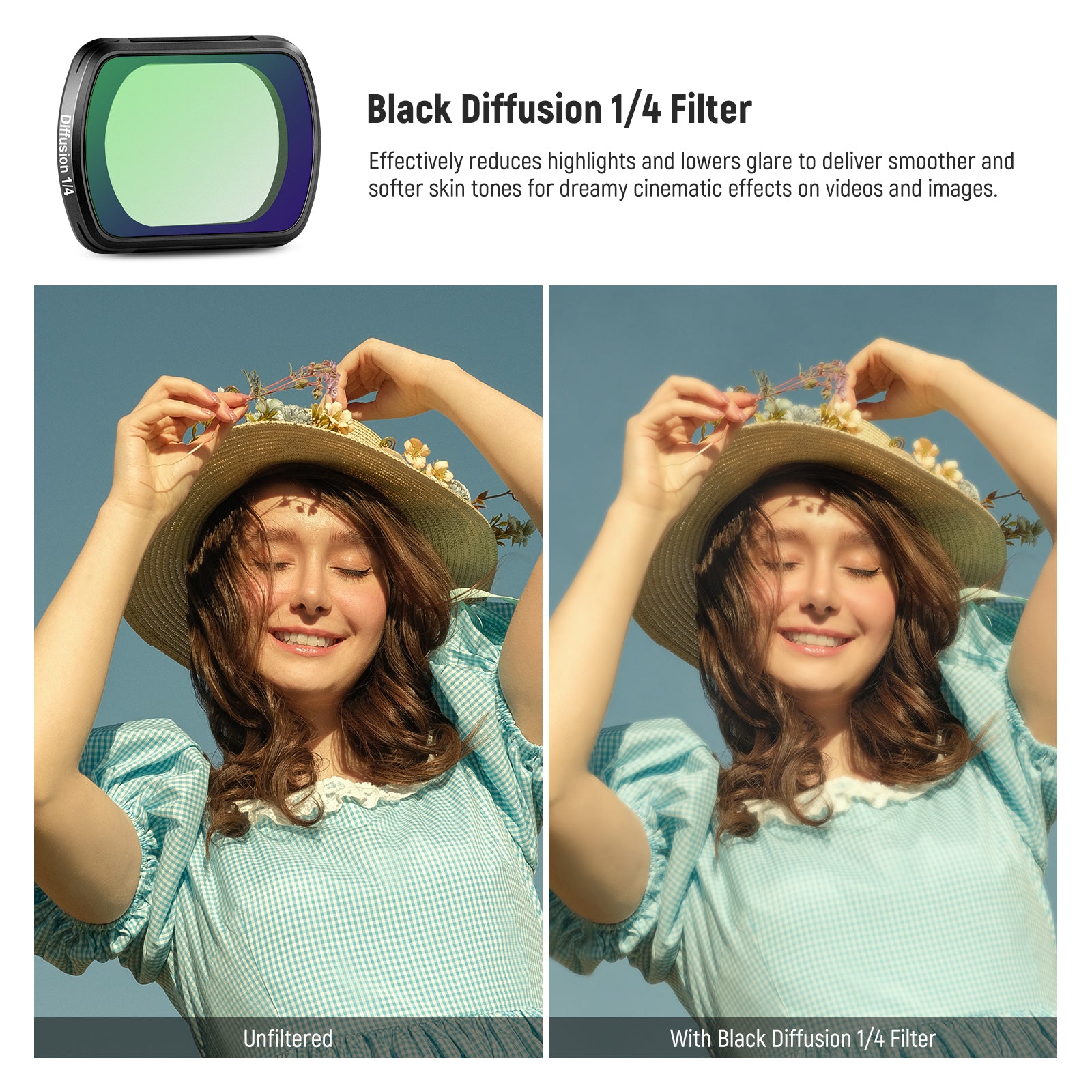 - Dreamy Cinematic Vibe & Stunning Night Footages- The black diffusion 1/4 filter with a dreamy cinematic effect reduces highlights and lowers the glare for a hazier and softer look, ideal for portraits, videos, and vlogs. The light pollution reduction filter reduces the yellow/green color caused by city lights, captures details of your filming subject, keeps proper contrasts, and avoids overexposure