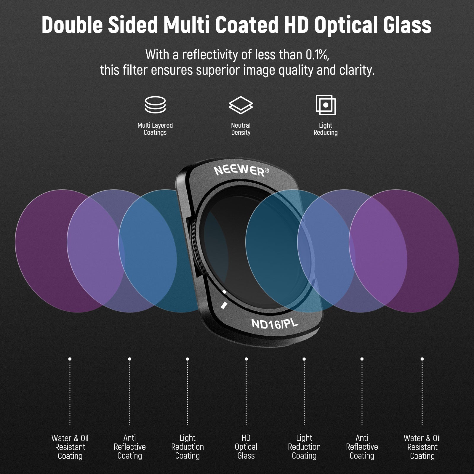 - Multi-Coated HD Optical Glass- With 30 layers of multi functional coatings on both sides of the HD optical glass, these handheld action camera filters are water repellent, scratch resistant, and oil proof, ensuring long lasting optical quality in challenging environments