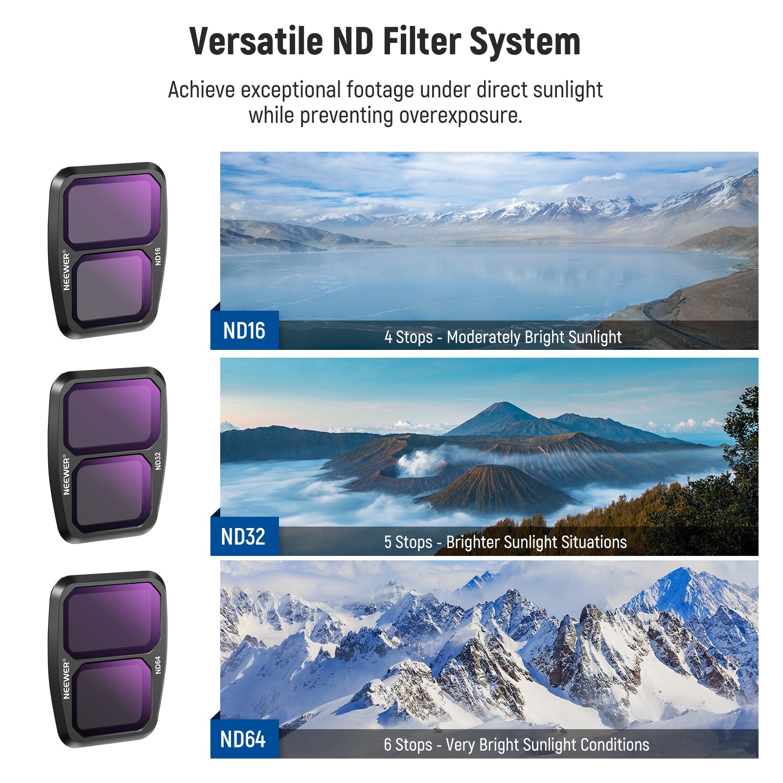 - Balanced Exposure for Landscape- The ND16, ND32, and ND64 drone lens filters provide varying levels of light reduction, ranging from 4 to 6 stops. These filters allow for precise exposure control in different lighting conditions, enabling creative effects like motion blur and shallow depth of field in drone photography and videography