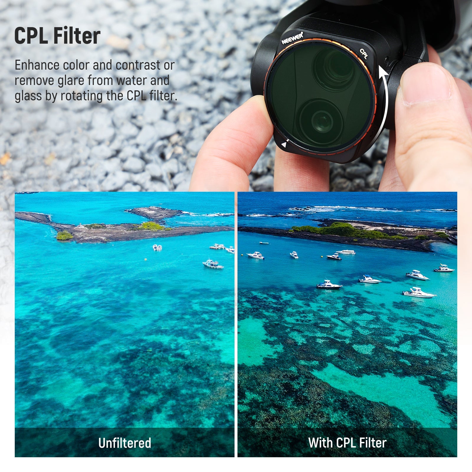 - Vivid Color Reproduction- Add vibrancy to your drone shots with the included CPL filter. It helps to reduce glare and unwanted reflections from surfaces such as water, glass, and metallic objects, which will enhance the color and clarity of your aerial shots, resulting in sharper eye-catching images