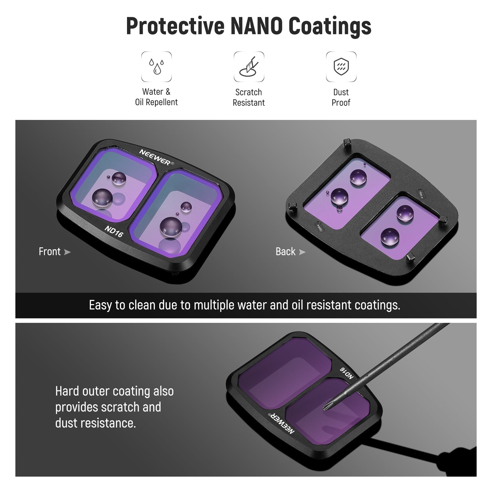 - NANO Coated HD Optical Glass- With 30 layers of multi functional NANO coatings on both sides of the HD optical glass, these filters are water repellent, scratch resistant, and oil proof