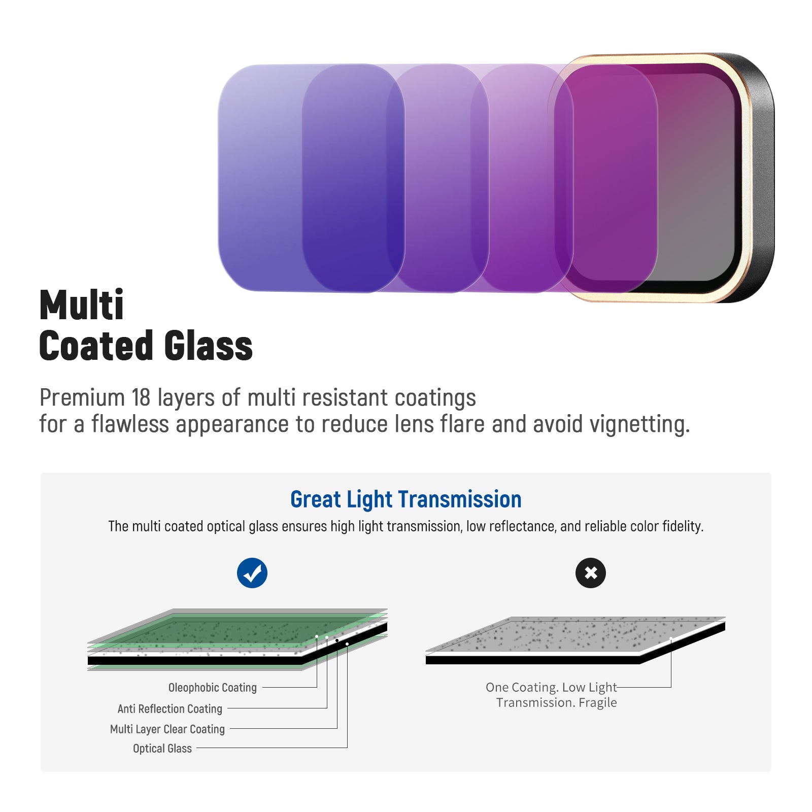 - MULTI COATED HD OPTICAL GLASS- Made of HD optical glass, a good level of transmittance, crystal clear glass for high definition video; Features water proof, oil proof, and scratch proof, reduces fingerprints fog. It also ensures low refractive index/outstanding color neutrality/perfect target transmission