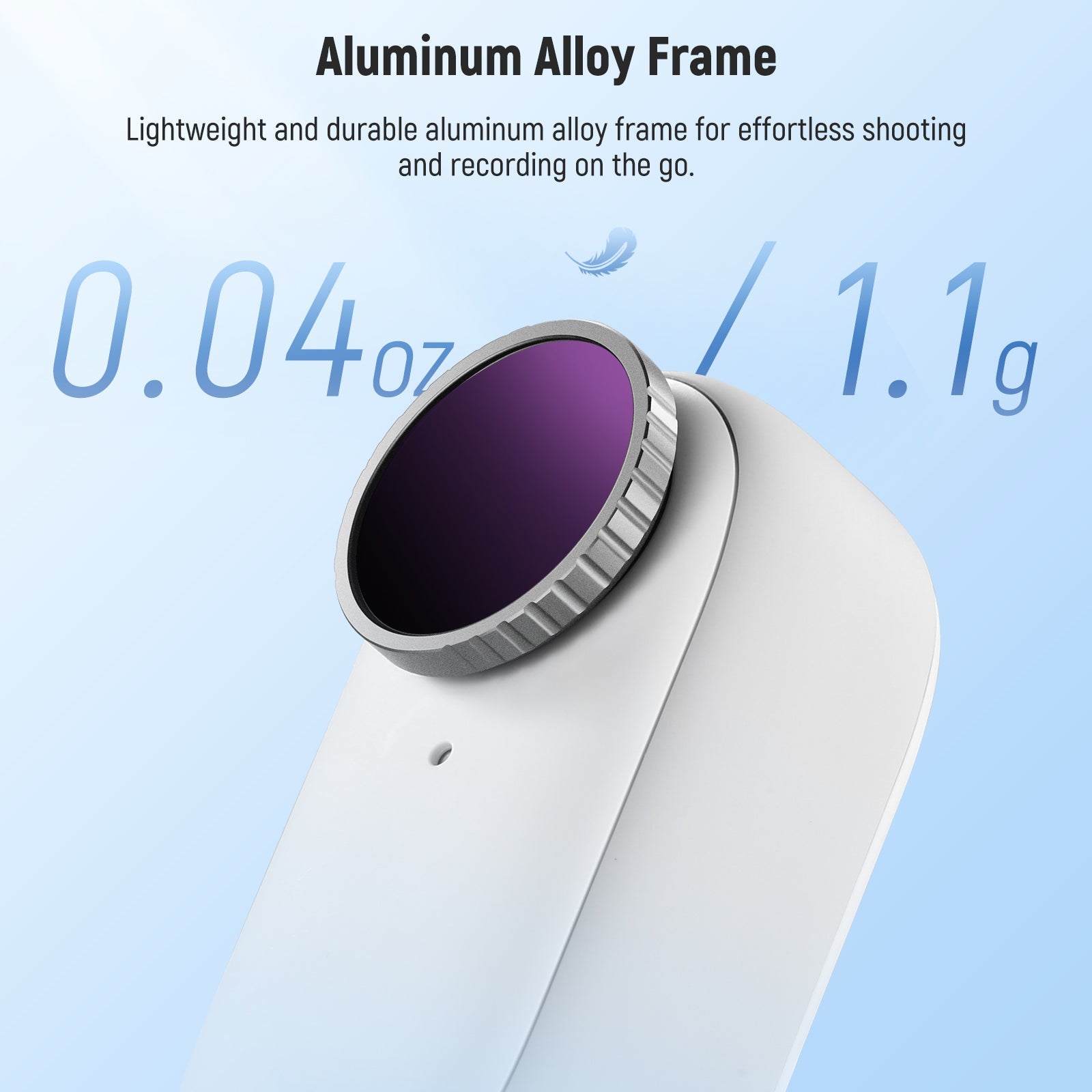- Quick & Easy Installation- Remove the original lens protector and twist it on for quick installation. The aluminum construction of the filter frame ensures durability, with a lightweight design of just 0.04oz/1.1g. The black anodized threads and patterned knurls allow for effortless setup and precise rotation