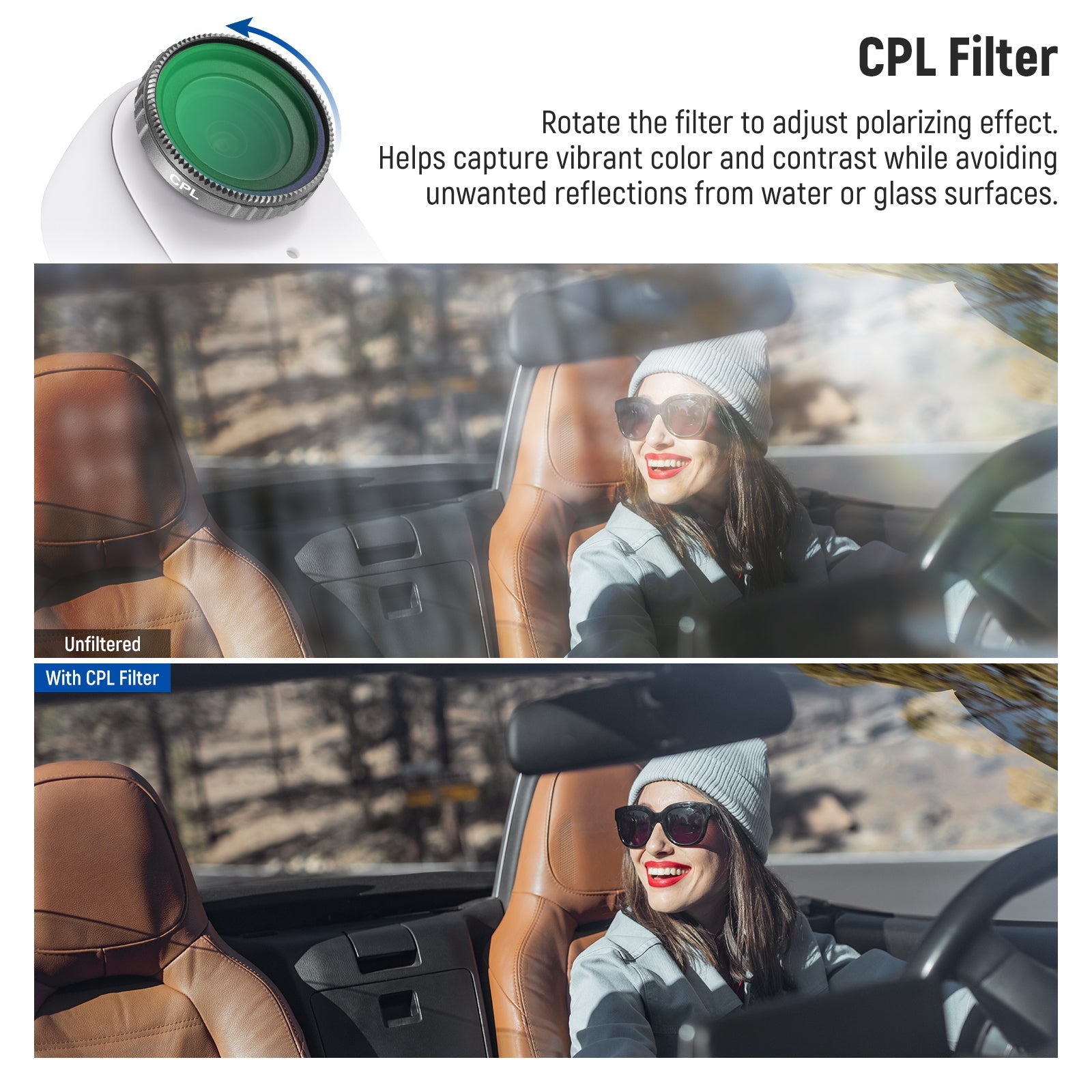 - Vivid Color Reproduction CPL/UV Filter- Rotate the included CPL filter to add vibrancy to your travel or sports vlogs. It effectively reduces glare and unwanted reflections from surfaces like water, glass, and metallic objects for sharper, captivating images and videos. A UV filter is also included to provide physical protection against dust, scratches, or bumps