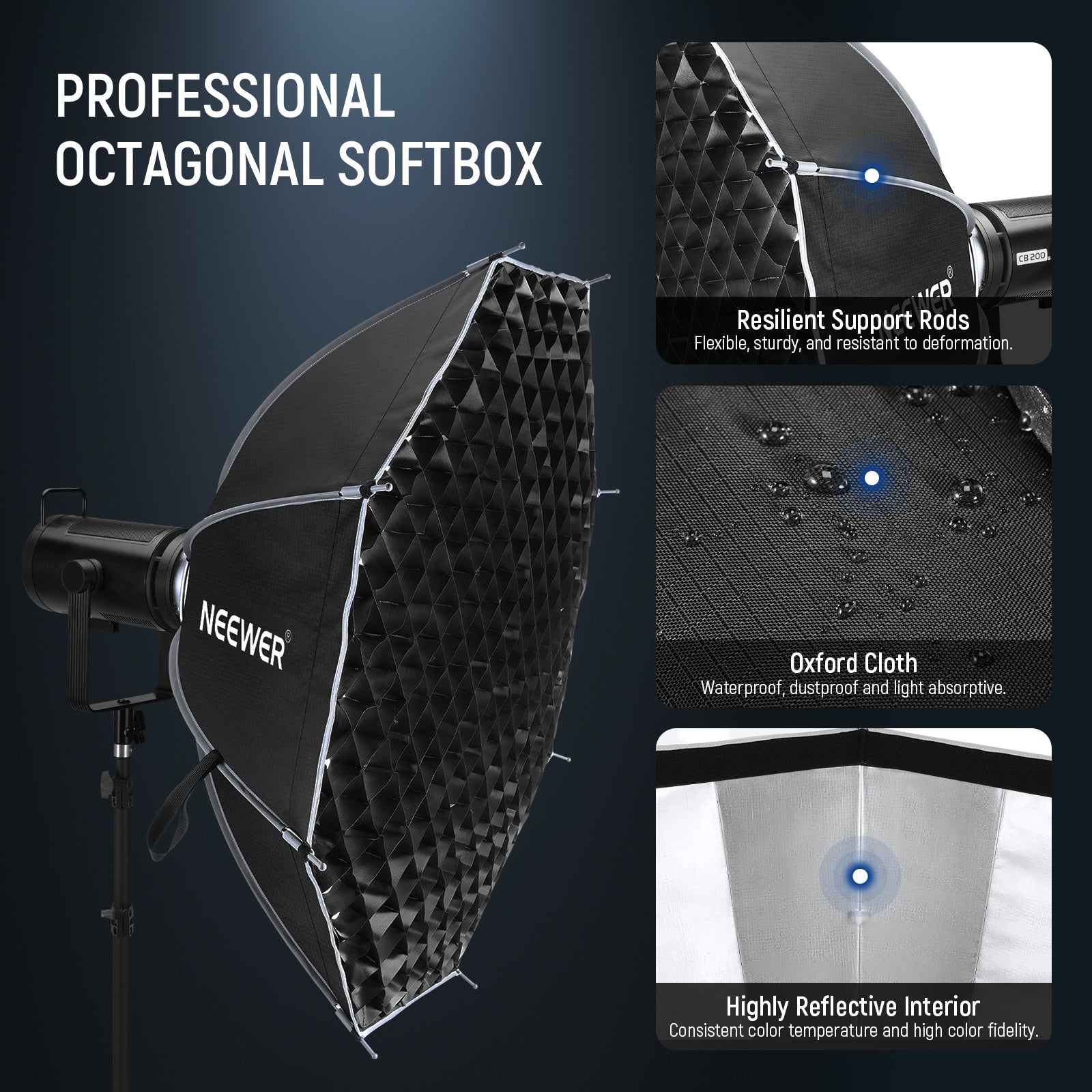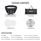 - Honeycomb Grid & Diffusers- The softbox lighting kit includes internal and external diffusers, which can be combined for an even softer and more diffused light. The honeycomb grid directs light at 45° and reduces spill, providing a distinctive soft yet punchy lighting effect that defines the model's facial structure