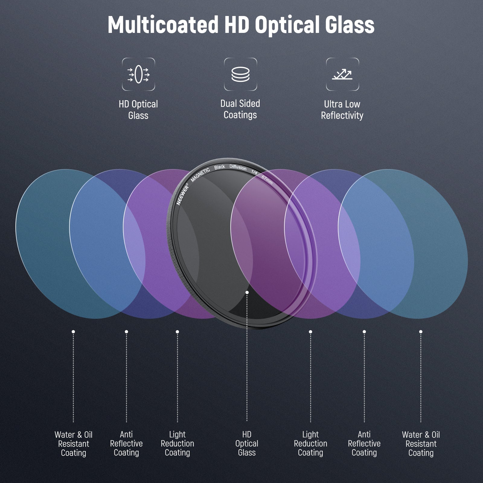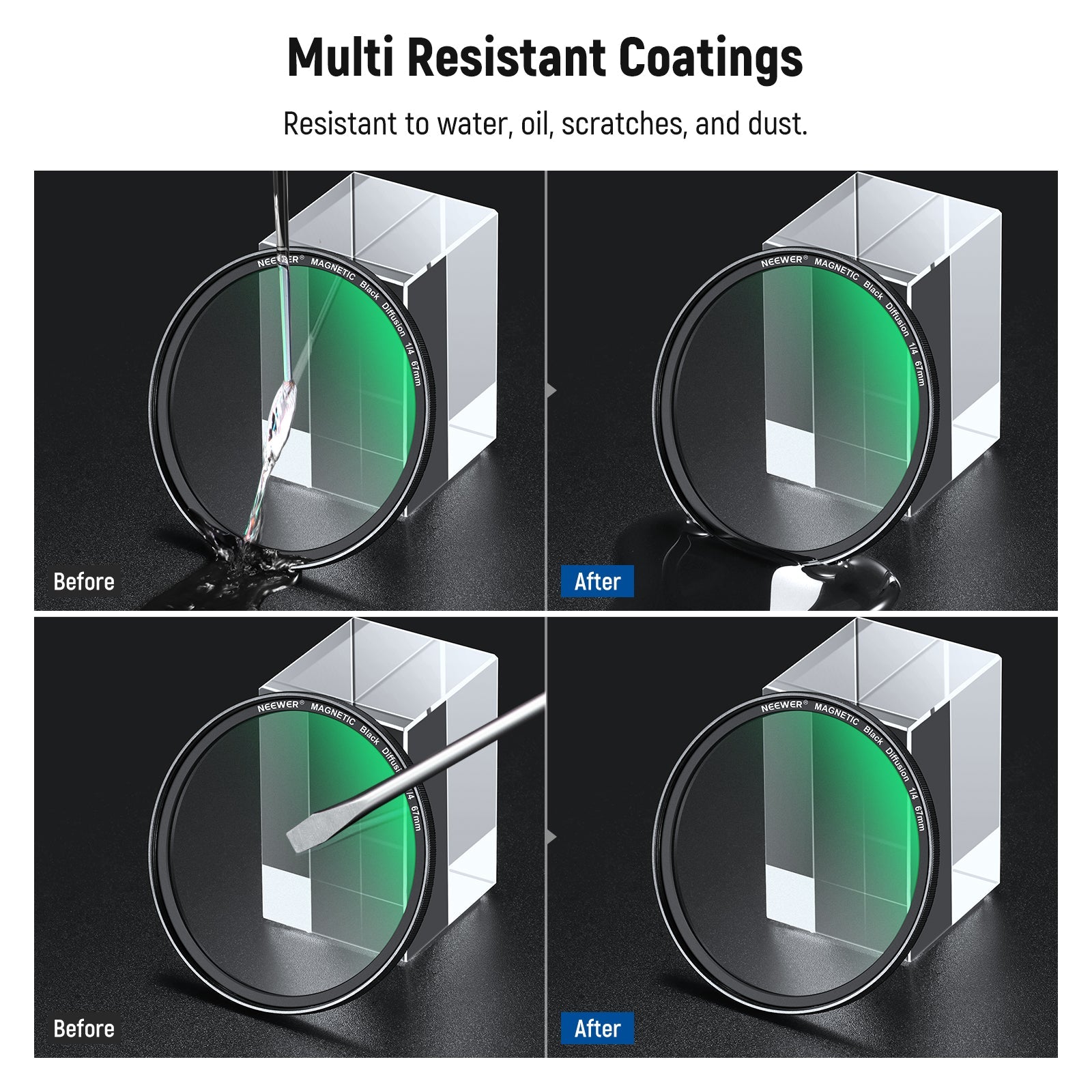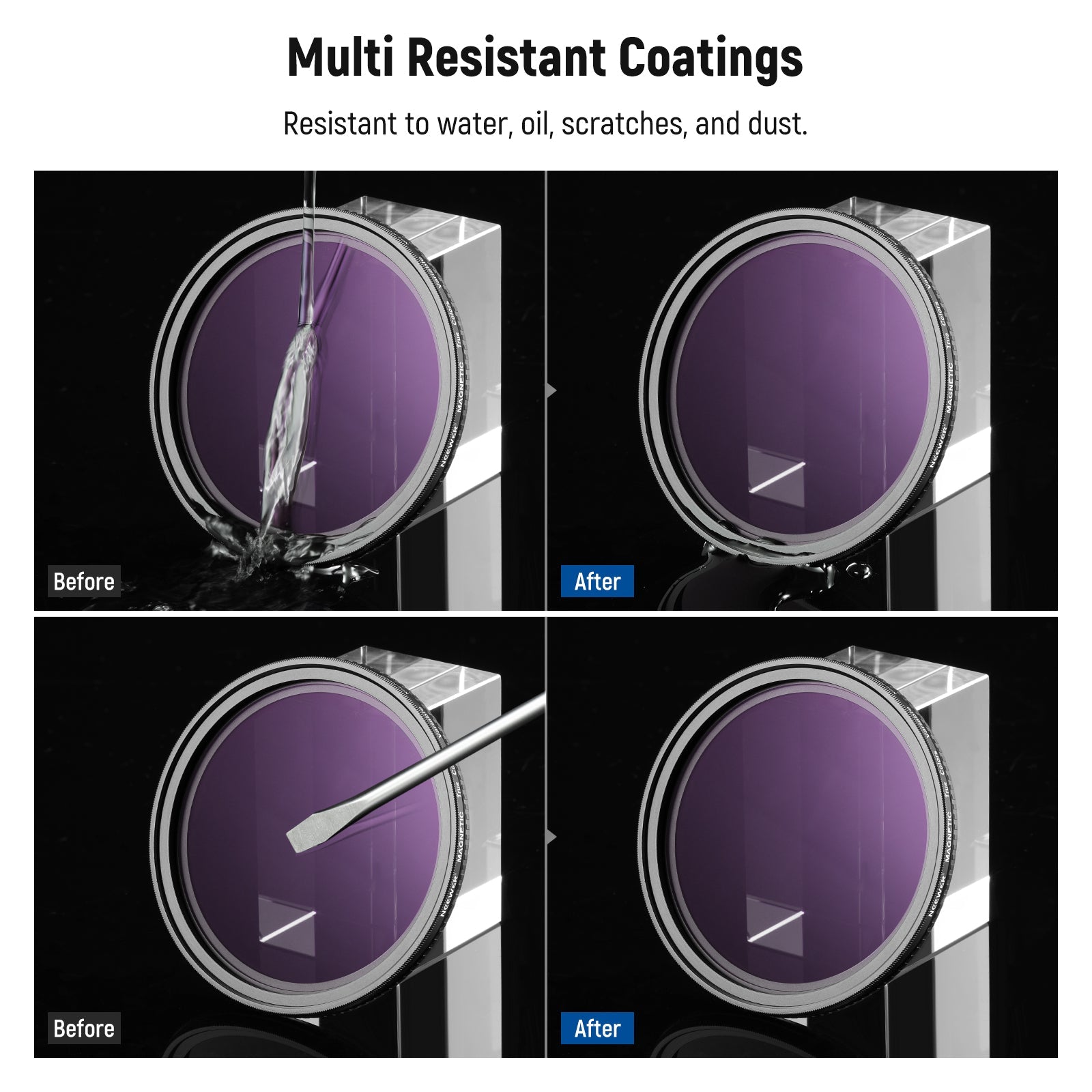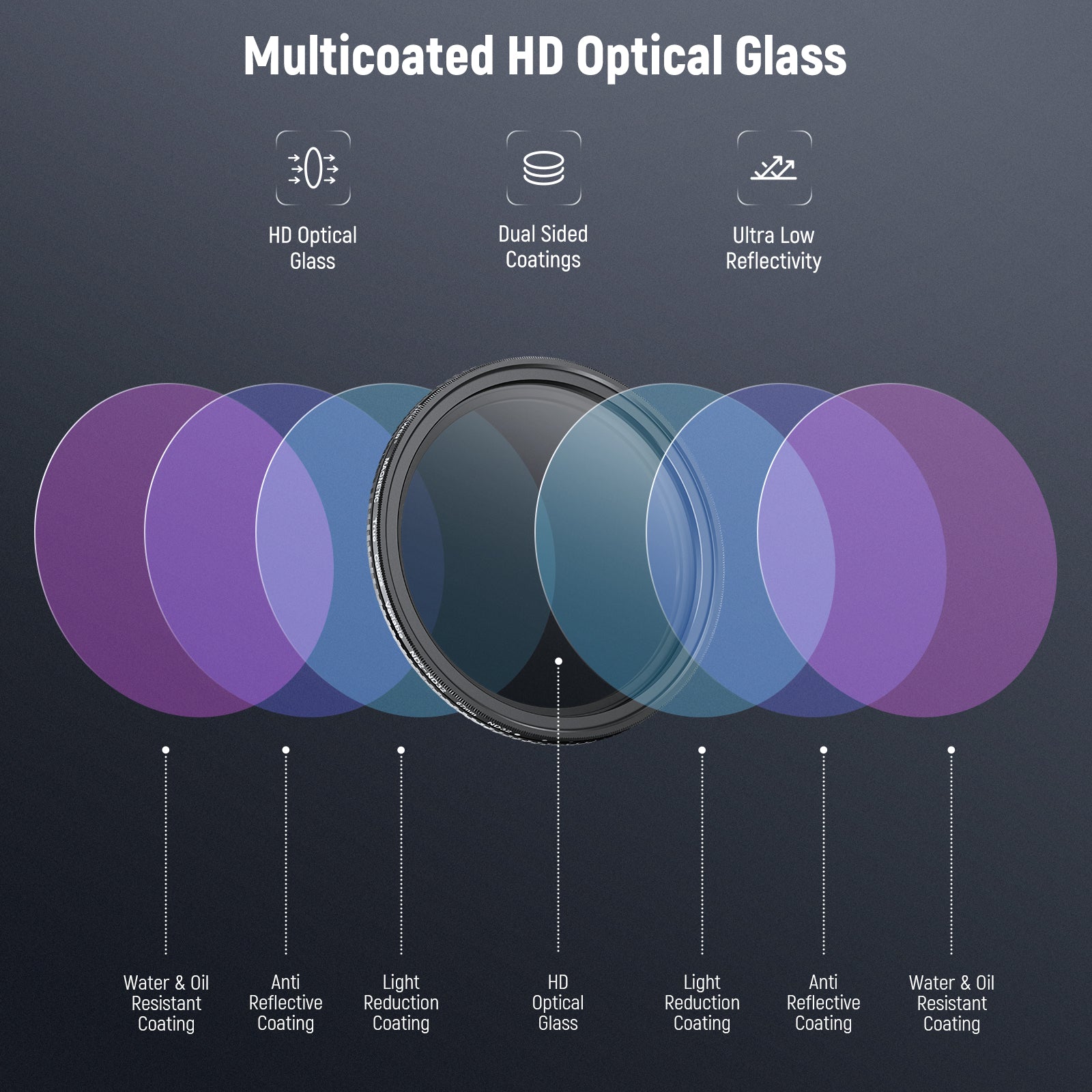 - Multicoated HD Optical Glass- HD optical glass ensures exceptional clarity and accurate color reproduction. Multiple protective coatings are resistant to water, smudges, fingerprints, and scratches. An included cleaning cloth helps you keep the filter spotless