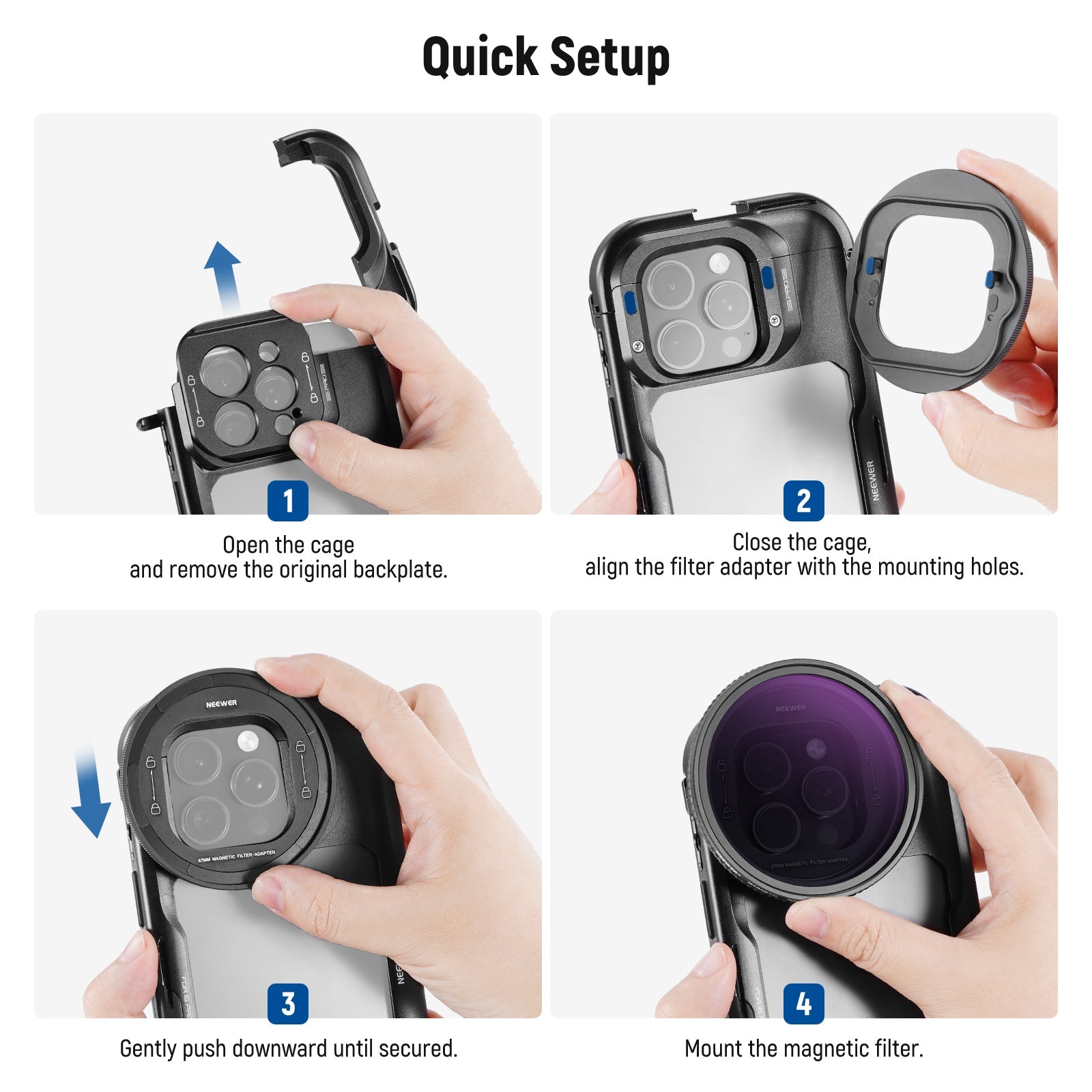 - Convenient Sliding Backplate- The magnetic filter adapter backplate is easy to install. Insert the mounting tabs into the slots on the phone cage, then slide downward until they lock into place. After that, simply snap on the filter and start shooting