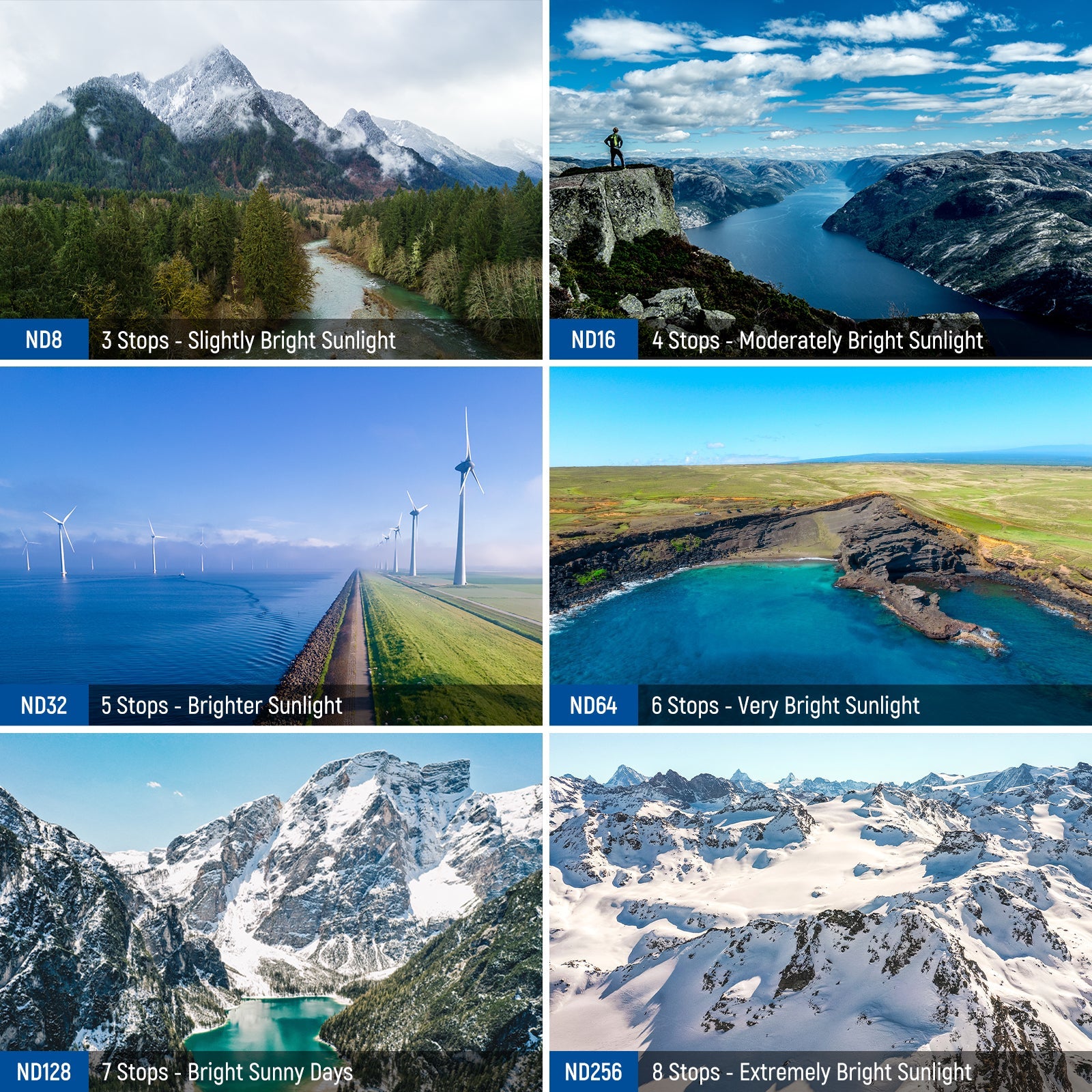- Balanced Exposure for Superior Outdoor Shots- The ND8, ND16, ND32, ND64 ND128 and ND256 action camera filters, featuring light reduction ranging from 3 to 8 stops, provide precise exposure control during dynamic outdoor activities. They effectively prevent overexposure and elevate image quality across a range of sunlight conditions
