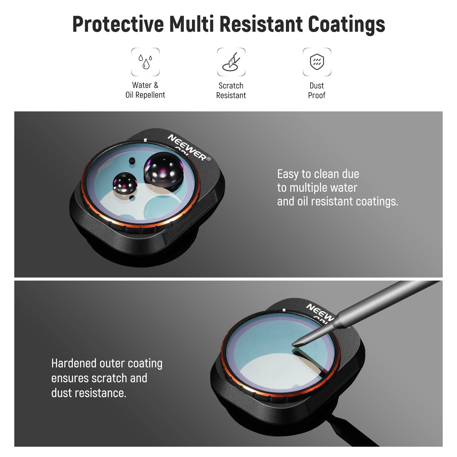 - Both Side Multi Coated HD Optical Glass- With 30 layers of multi functional coatings on both sides of the HD optical glass, these filters are water repellent, scratch resistant, and oil proof, ensuring long lasting optical quality in challenging environments