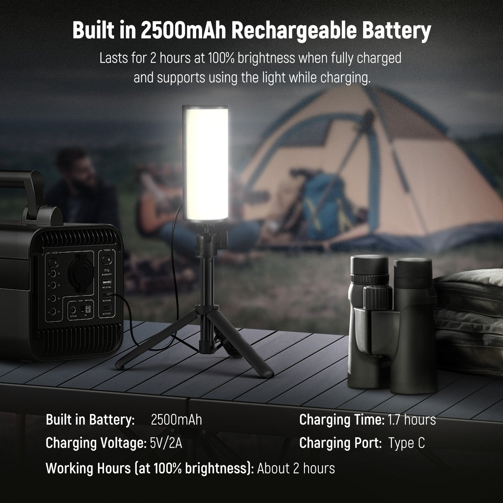 - Built in 2500mAh Rechargeable Battery- NEEWER TL96RGB film light features a built in 2500mAh lithium battery, providing up to 2 hours of continuous use at 100% brightness. Equipped with a USB Type C charging port on the back, it fully charges in 1.7 hours using the included USB cable and a wall charger (not included). Alternatively, power it with a portable charger or any 5V/2A USB power source for on the go photography and videography lighting
