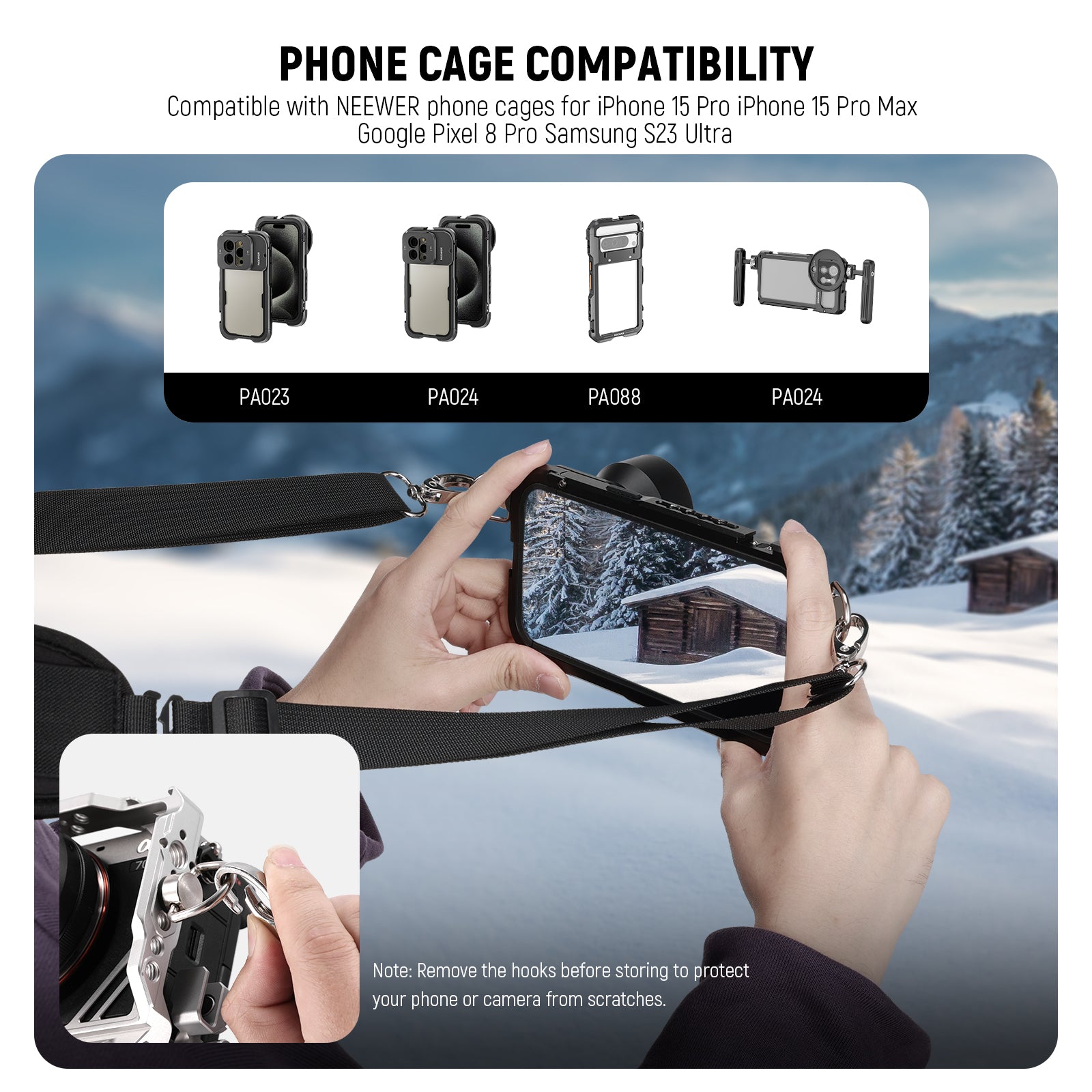 - For Most Phone/Camera Cages- Compatible with most NEEWER phone cages and camera cages, including PA023/PA024 for iPhone 15 Pro/15 Pro Max, PA021 for Galaxy S23 Ultra, A014 Universal Smartphone Video Rig, CA003S ZV-E10 Cage, CA043 X-S20 Cage, CA041 Z8 Cage, also compatible with SmallRig camera cages and phone cages with 1/4" threads. Remove the hooks before storing to protect your phone or camera from scratches