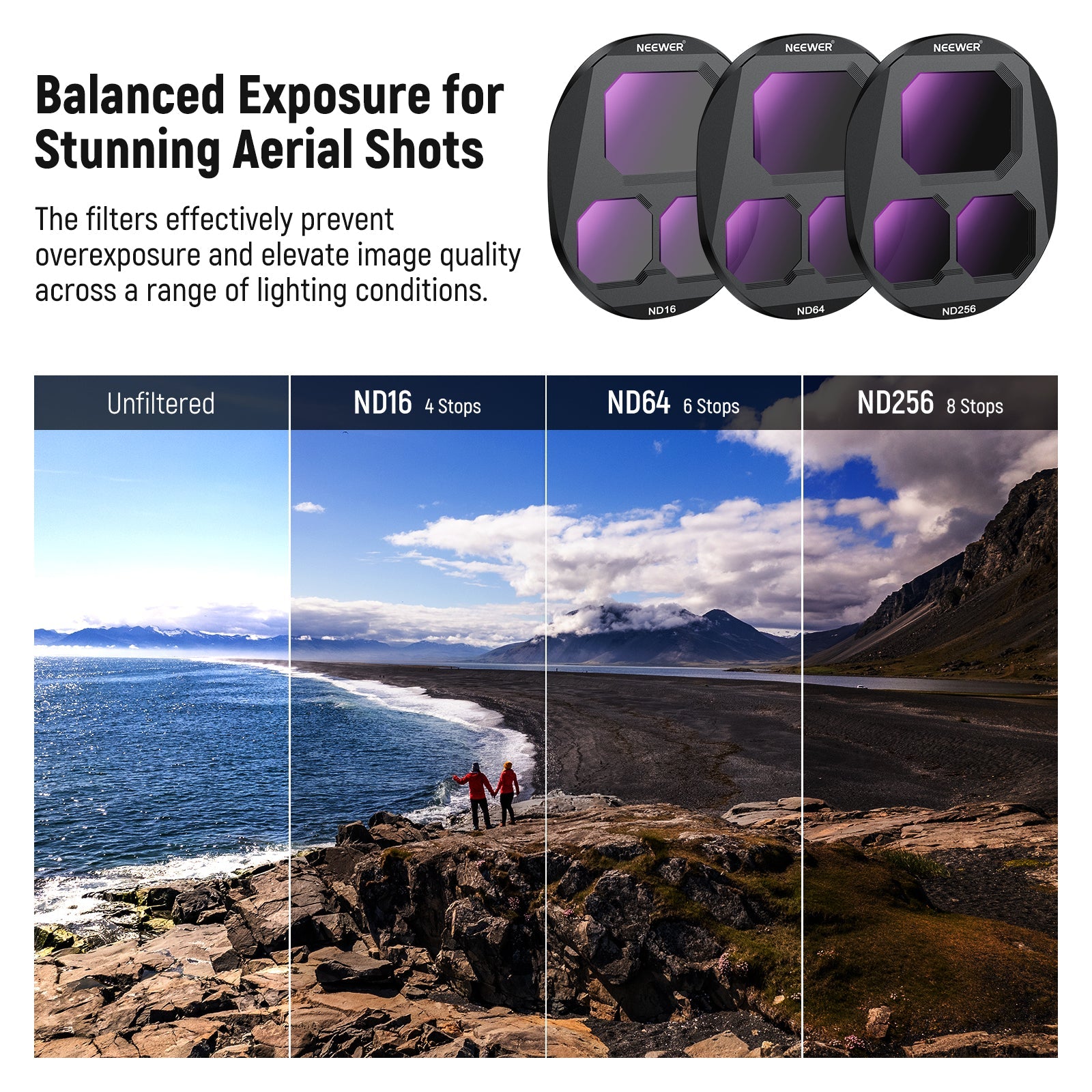 - Precise Exposure Control- The ND8, ND16, and ND32 filters reduce light by 3, 4, and 5 stops, respectively. They can effectively prevent overexposure in bright environments and add a dynamic motion blur effect to your shots