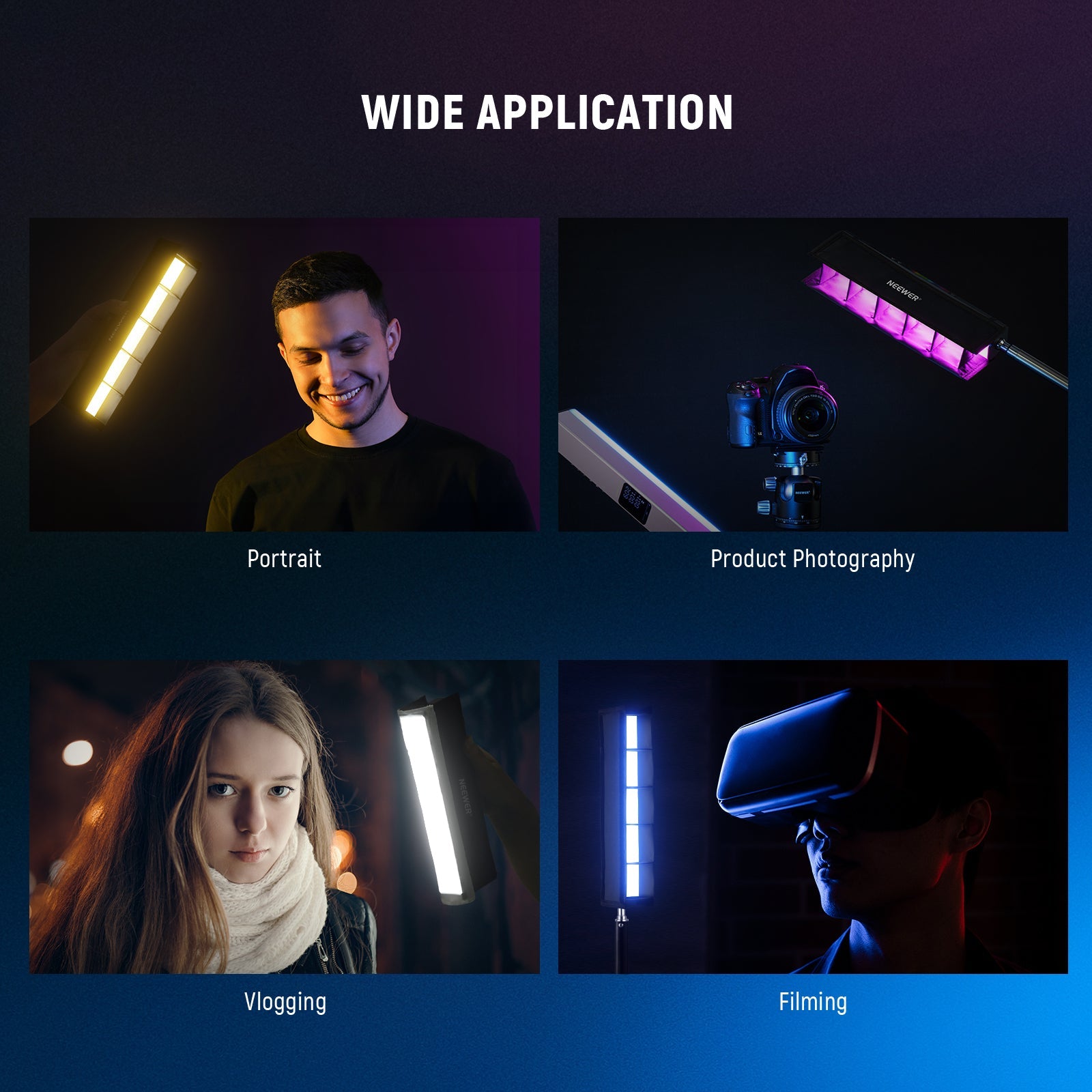 - Intelligent App Control- The “NEEWER” app lets you wirelessly operate this RGB video light from up to 164’ (50m) away and take advantage of all the functions. Within the app, you can change brightness, color temperature, hue, and saturation, select scenes, and save multiple presets for future use. An RGB color wheel lets you pick any color with one tap