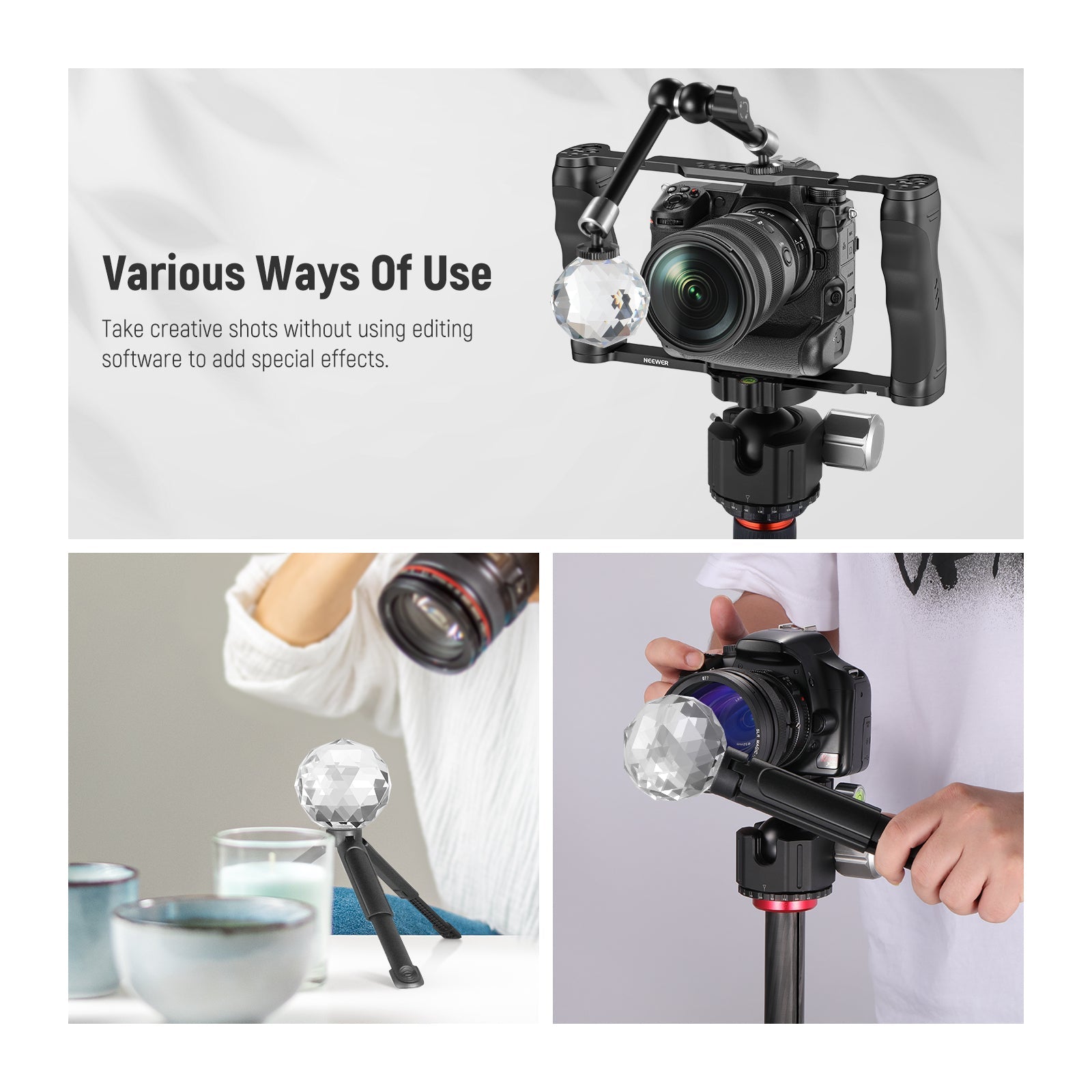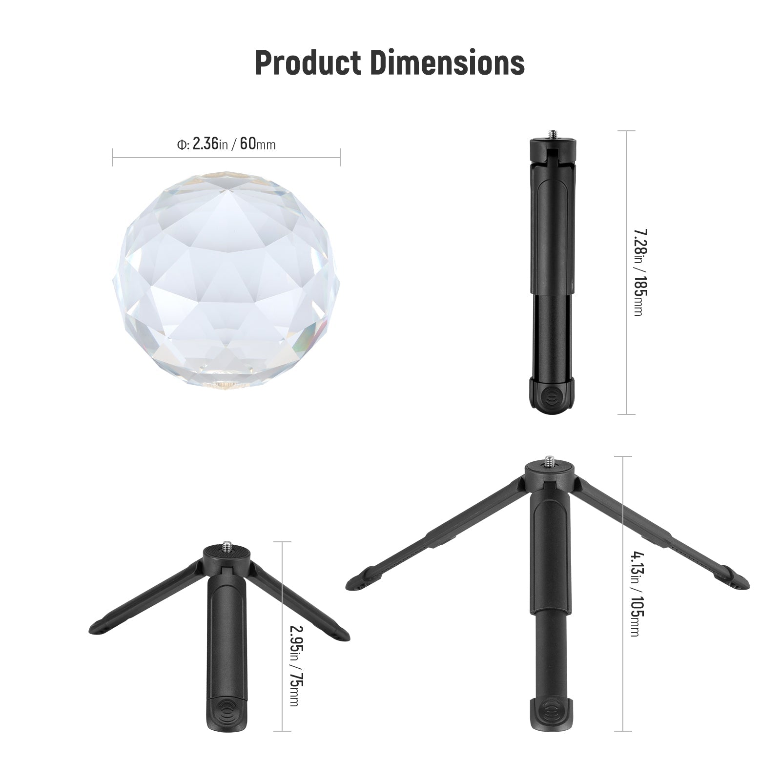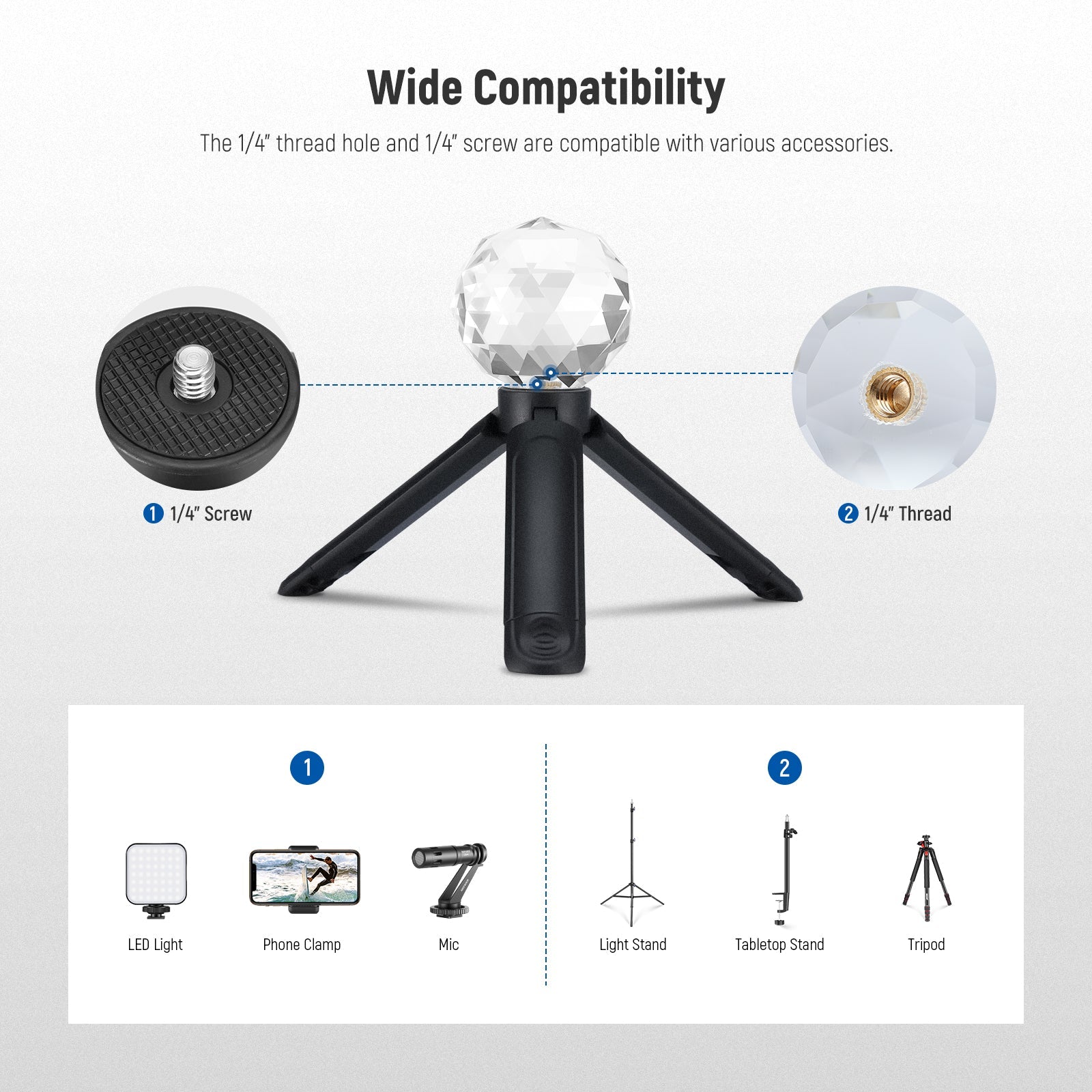 - Handfree with 1/4" Thread Mount- Mount the ball on the included desktop stand or other stands via the 1/4" thread for handsfree positioning. You can also place it in front of the camera lens through an articulating arm to capture beautiful color effects