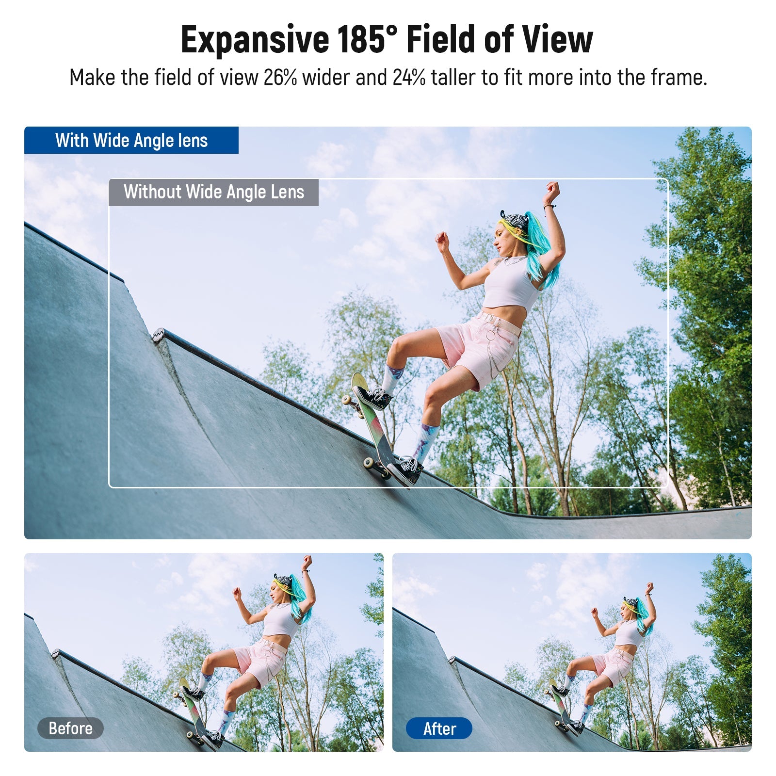 - Wide Angle Lens with 185° FOV- The wide angle lens expands the field of view (FOV) to 185° and creates a slightly distorted effect for creative shots, perfect for landscape, street photography, and group portraits. Its highly transmissive aspherical lens construction delivers exceptional clarity