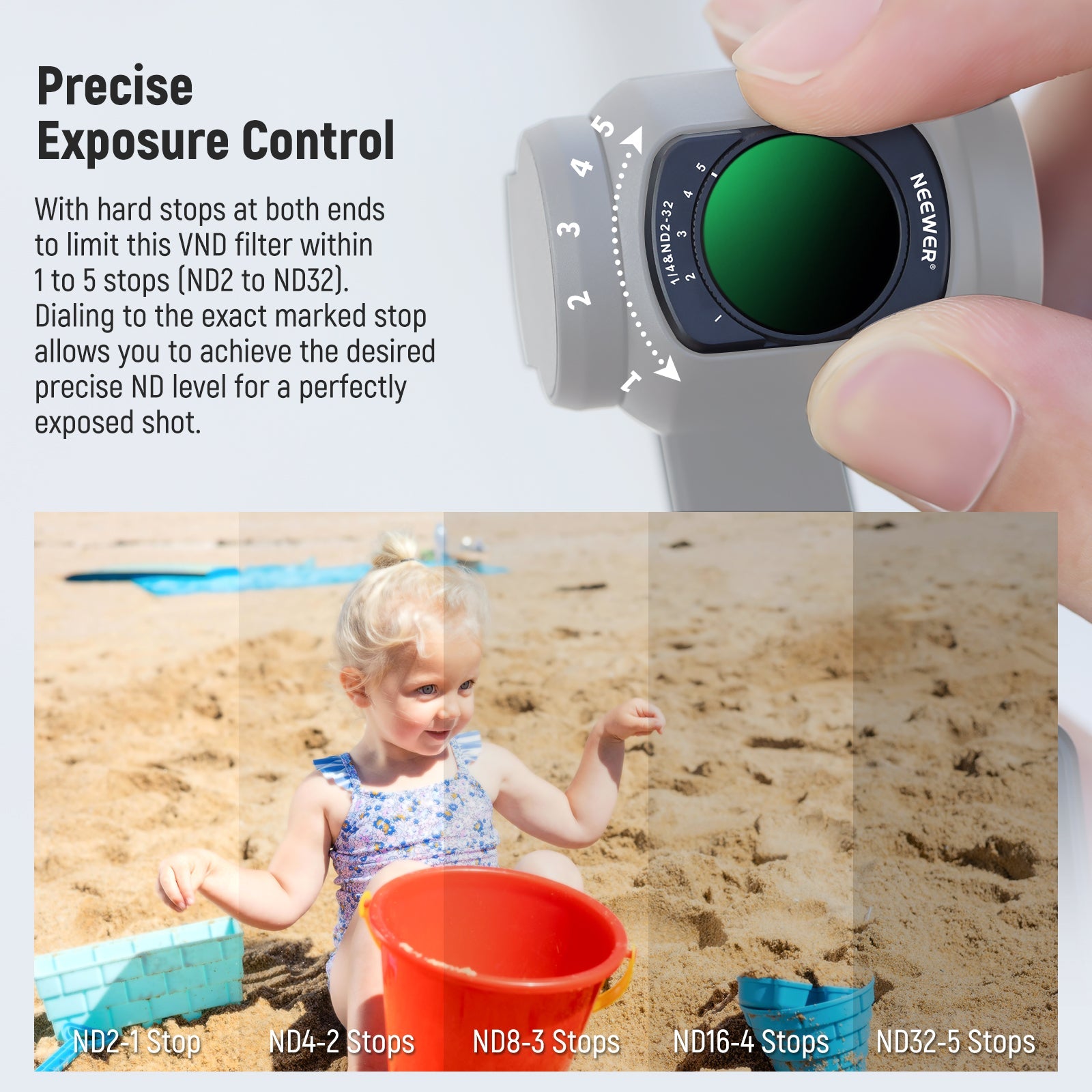 - 1-5 Hard Stops for Precise Exposure Control- Featuring hard stops at both ends to limit the VND filter to 1 to 5 stops (ND2 to ND32). Adjusting to the exact marked stop enables precise ND level selection for perfect exposure, capturing every instance with exceptional motion blur and clarity. Note: Using the maximum aperture may result in an X shaped black cross due to the VND filter's interaction with certain lenses and focal lengths