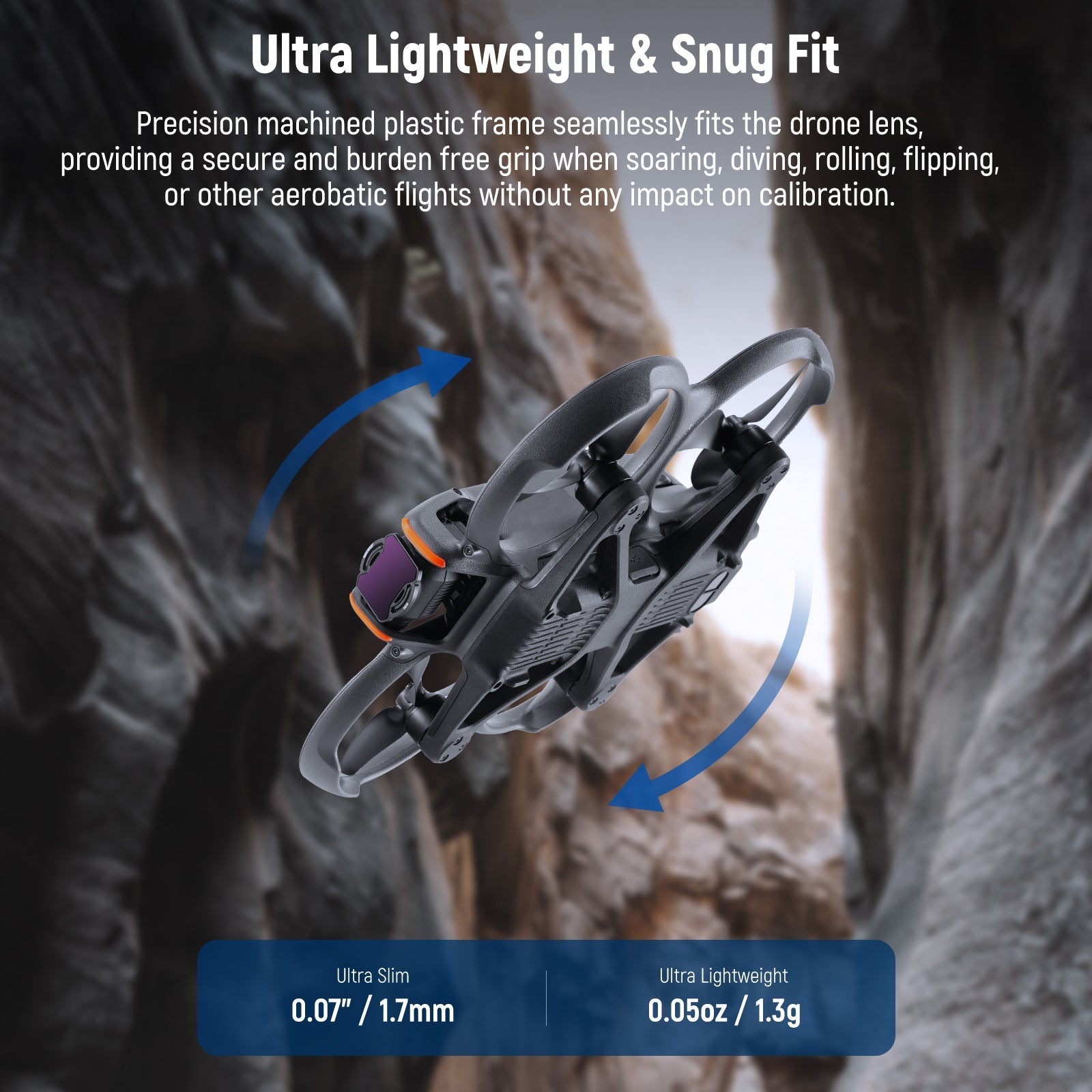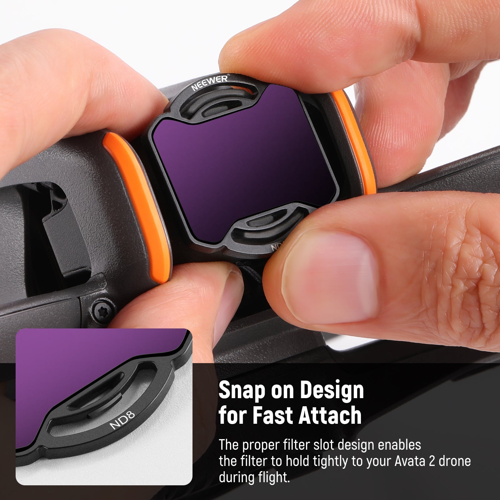 - Fully Compatible with Avata 2- NEEWER ND&UV Filter Set compatible with DJI Avata 2 includes ND8, ND16, ND32, ND64, ND256 filters and UV filter, enabling you to select the perfect neutral density filter to precisely control the aperture and shutter speed, as well as protecting your lens from dust and scratches. Mount these filters on your drone’s lens, improve exposure control in varying weather conditions to deliver magic and thrilling drone shots