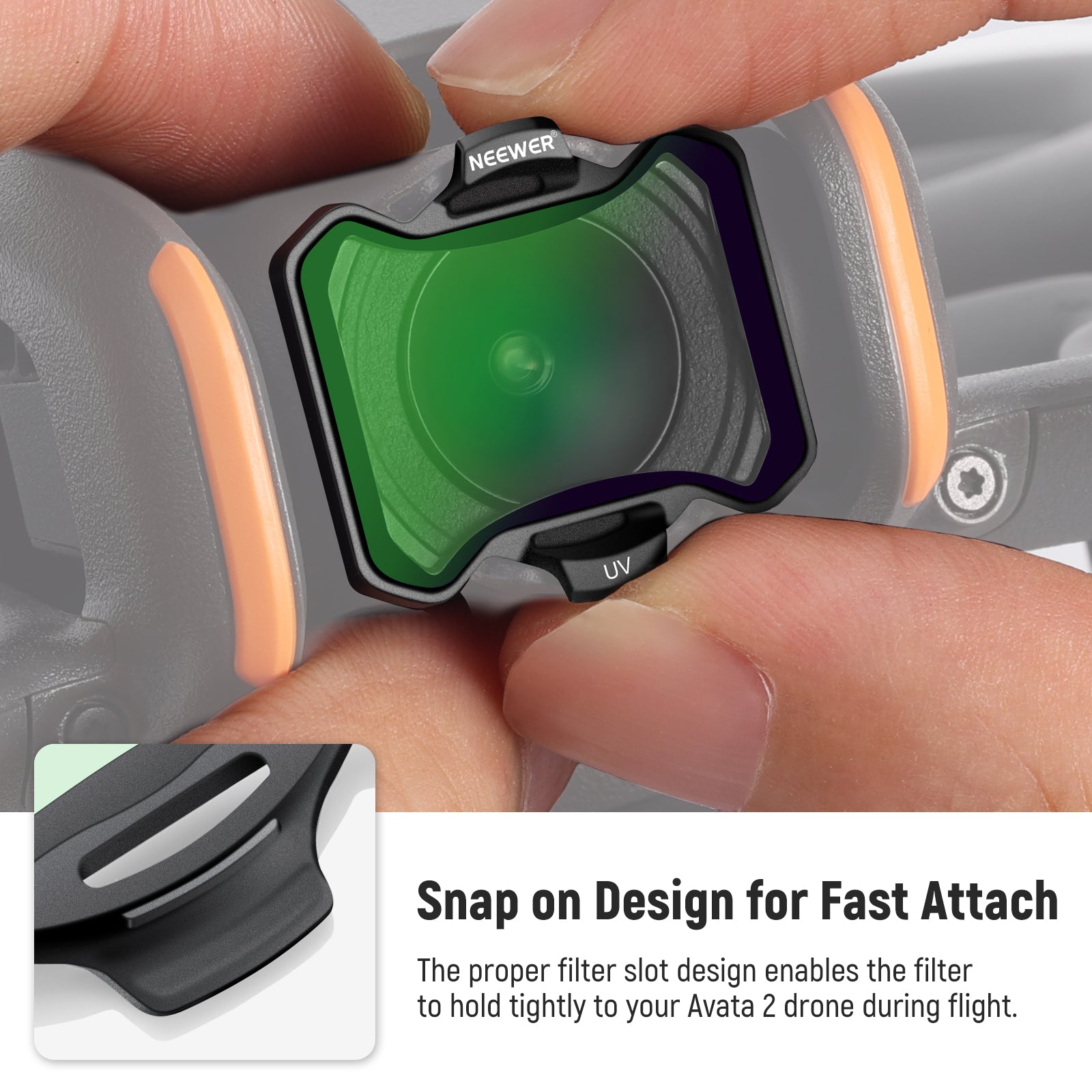 - Fully Compatible with Avata 2- NEEWER ND&UV&CPL Filter Set compatible with DJI Avata 2 includes ND8 ND16 ND32 ND64 filters, CPL filter, and UV filter, enabling you to precisely control the aperture and shutter speed, protecting your lens from dust and scratches, and presenting true to life color reproduction. Mount these filters on your drone’s lens, improve exposure control in varying weather conditions to deliver magic and thrilling drone shots with natural colors