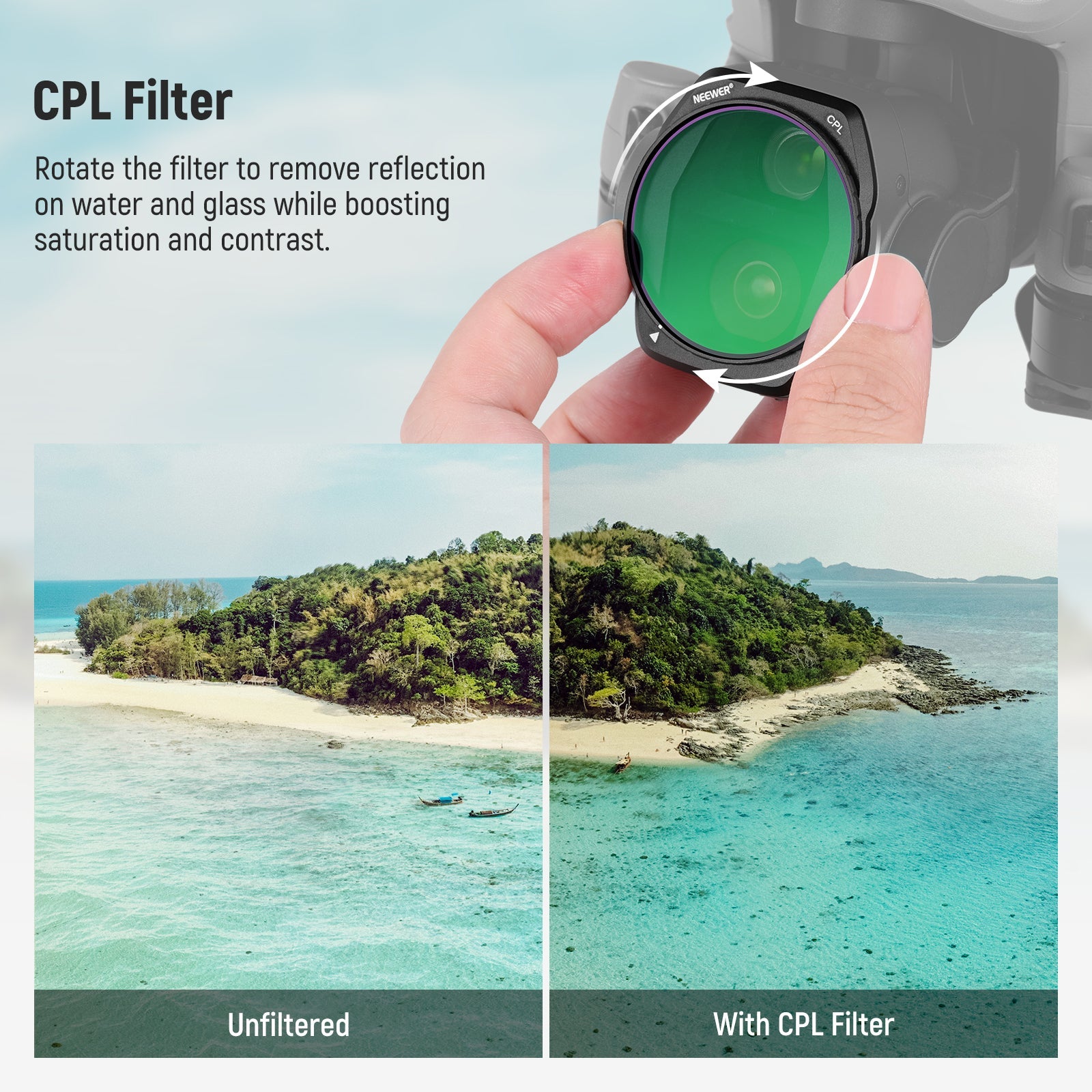 - Enhance Saturation/Contrast- The CPL (circular polarising) filter minimizes reflection on nonmetallic surfaces, such as glass and water, and improves saturation and contrast for vibrant colors
