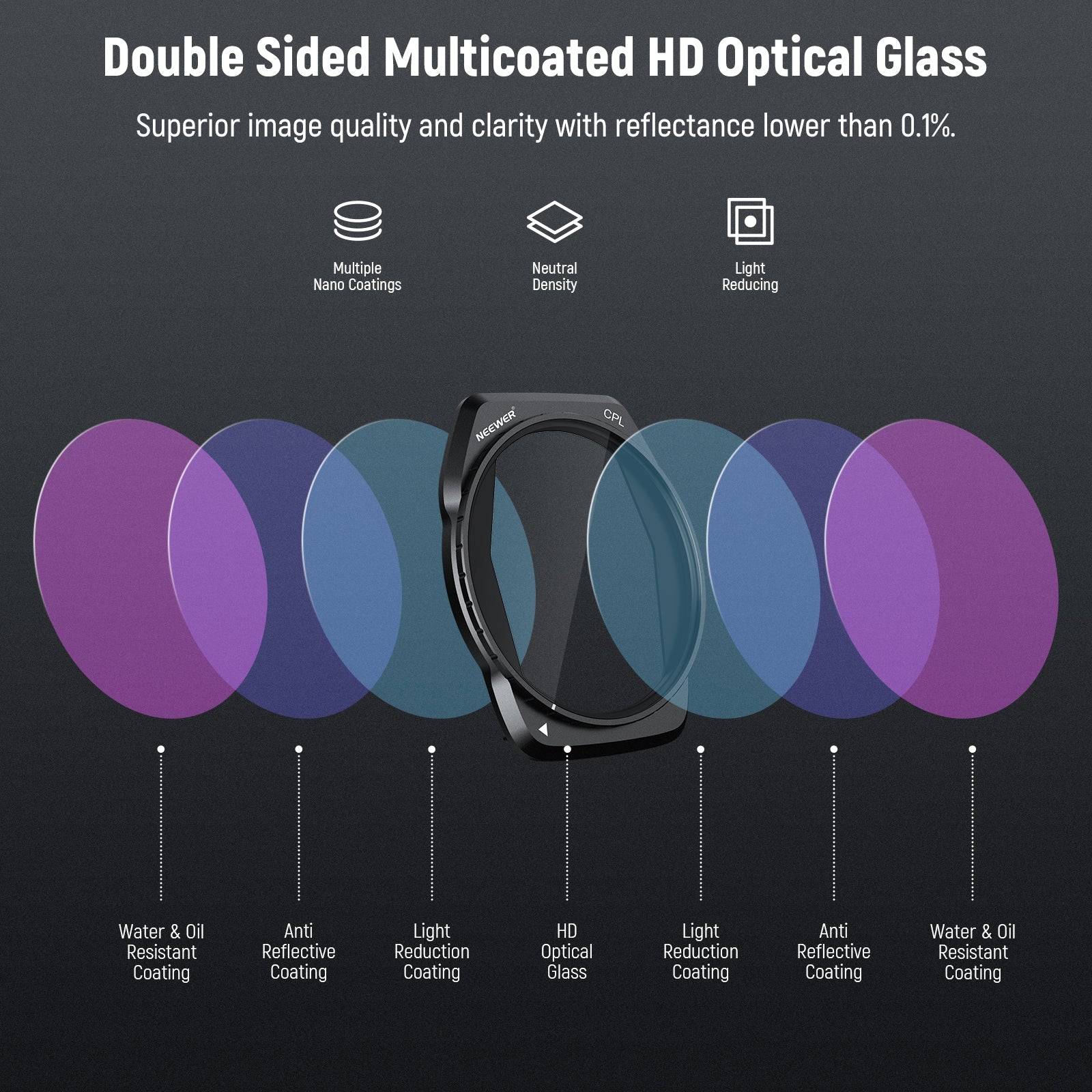 - Multicoated HD Optical Glass- HD optical glass ensures high clarity and accurate color reproduction. Multiple coatings on both sides of the glass are resistant to water, fingerprints, smudge, and scratches, making filters easy to clean