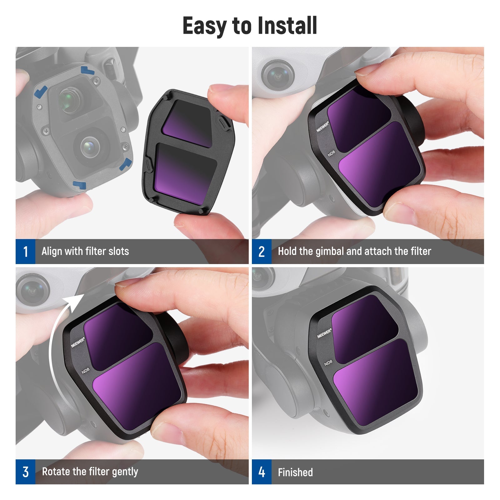 - Secure Twist On Installation- Remove the existing protective lens. Align the mounting tabs of the filter with the slots on the gimbal camera, then twist gently to secure. This ensures a firm and stable fit for smooth filming without affecting gimbal calibration