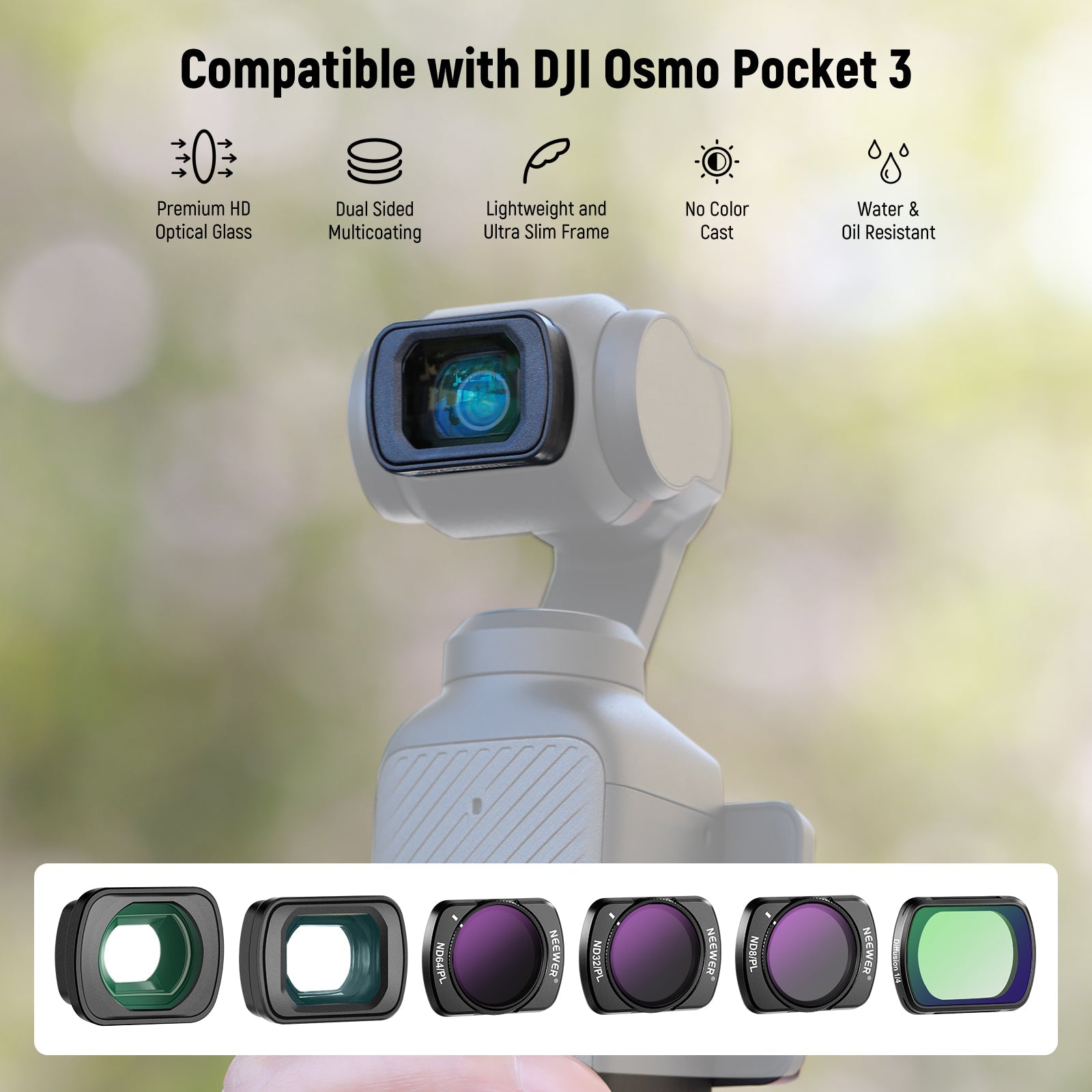- Compatible with DJI Osmo Pocket 3- This filter and lens accessories kit is designed for Osmo Pocket 3 Gimbal Camera and its Creator Combo. It offers three polarized neutral density filters (ND8/PL, ND32/PL, ND64/PL), a black diffusion 1/4 filter, a 0.75X wide angle lens, and a 2X macro lens to enhance your gimbal gear's photography and action video recording as content creator essential gear and influencer must have