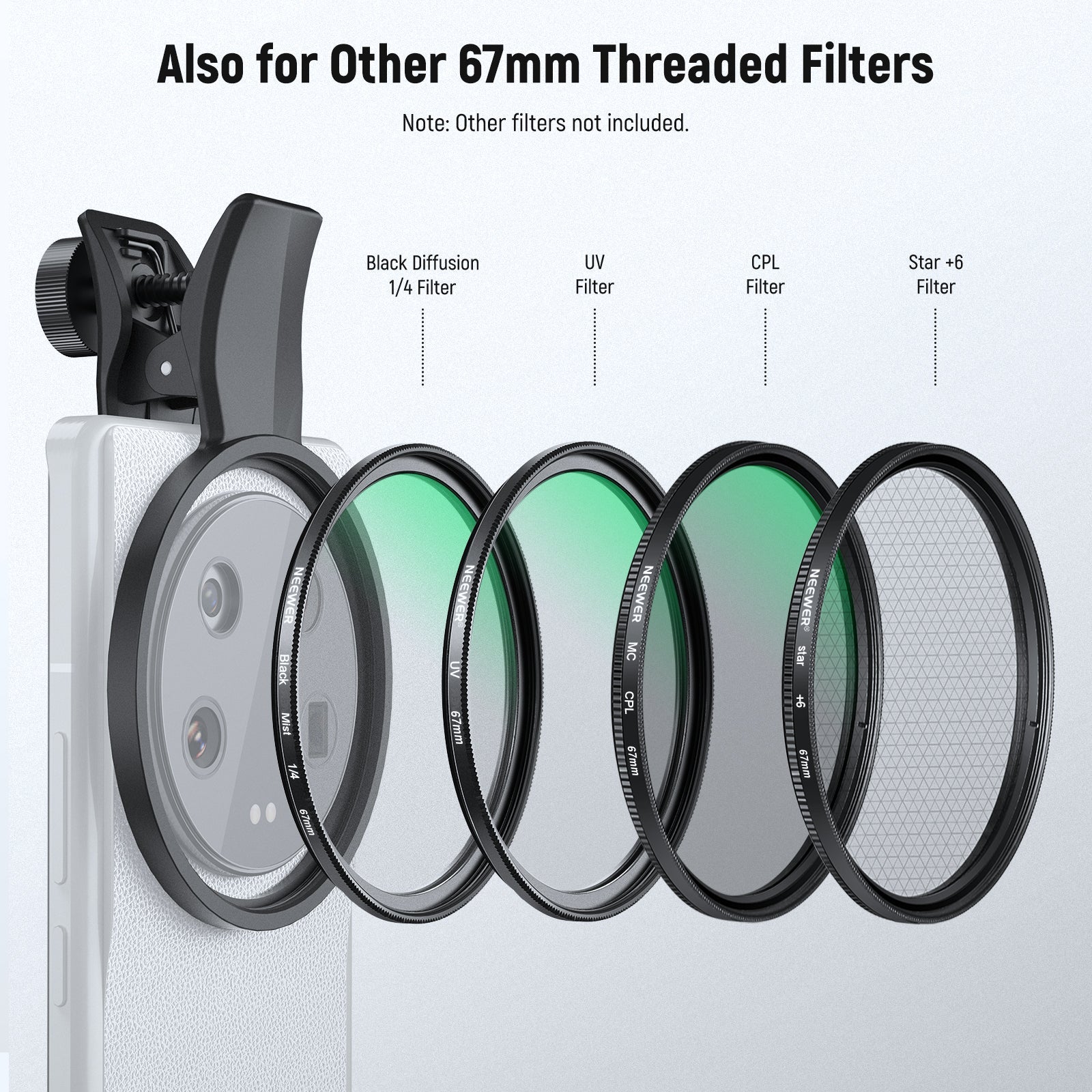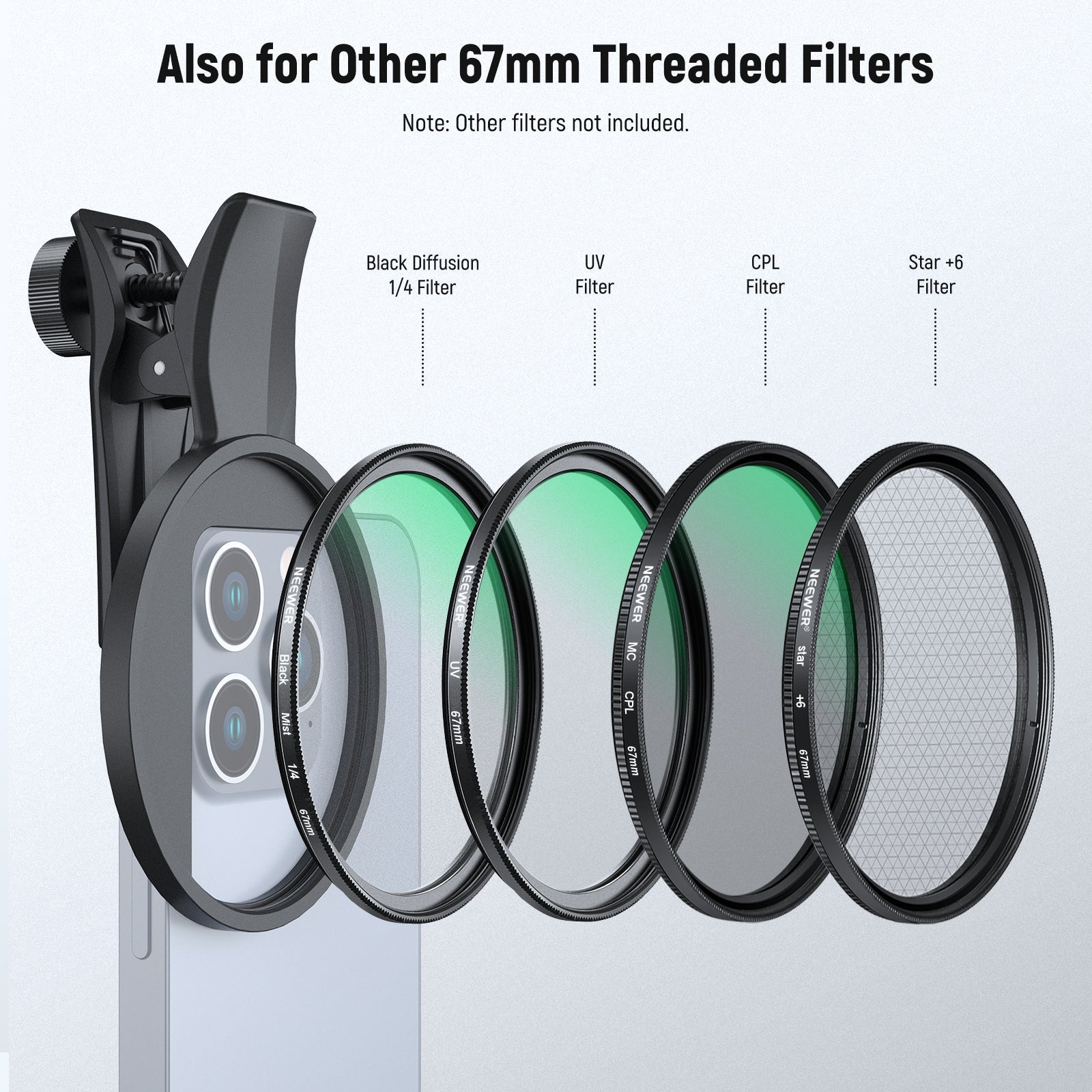 - Wide Compatibility- The phone filter clip is compatible with iPhone 16 Pro Max 16 Plus 16e 15 Pro Max 15 Plus 14 13 mini 12 11 X and other iPhone models. It works with any 67mm filter, including CPL, ND, UV, starlight, black diffusion, GND, and blue/gold streak effect lenses