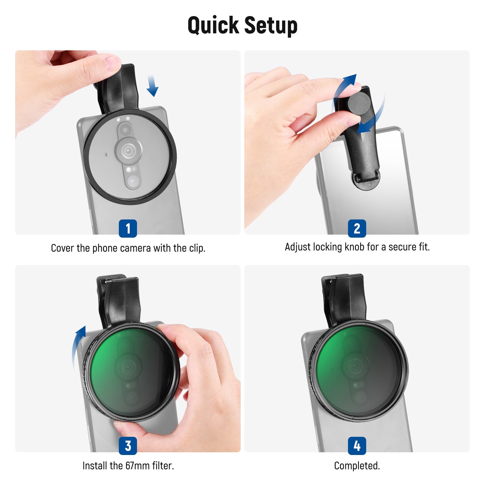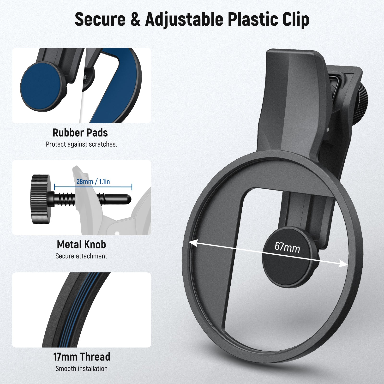- Secure & Adjustable Clip- The filter clip features an adjustable screw that lets you customize the clip opening and firmly secure the clip during use. Soft and nonslip rubber pads add extra stability and protects the phone from scratches
