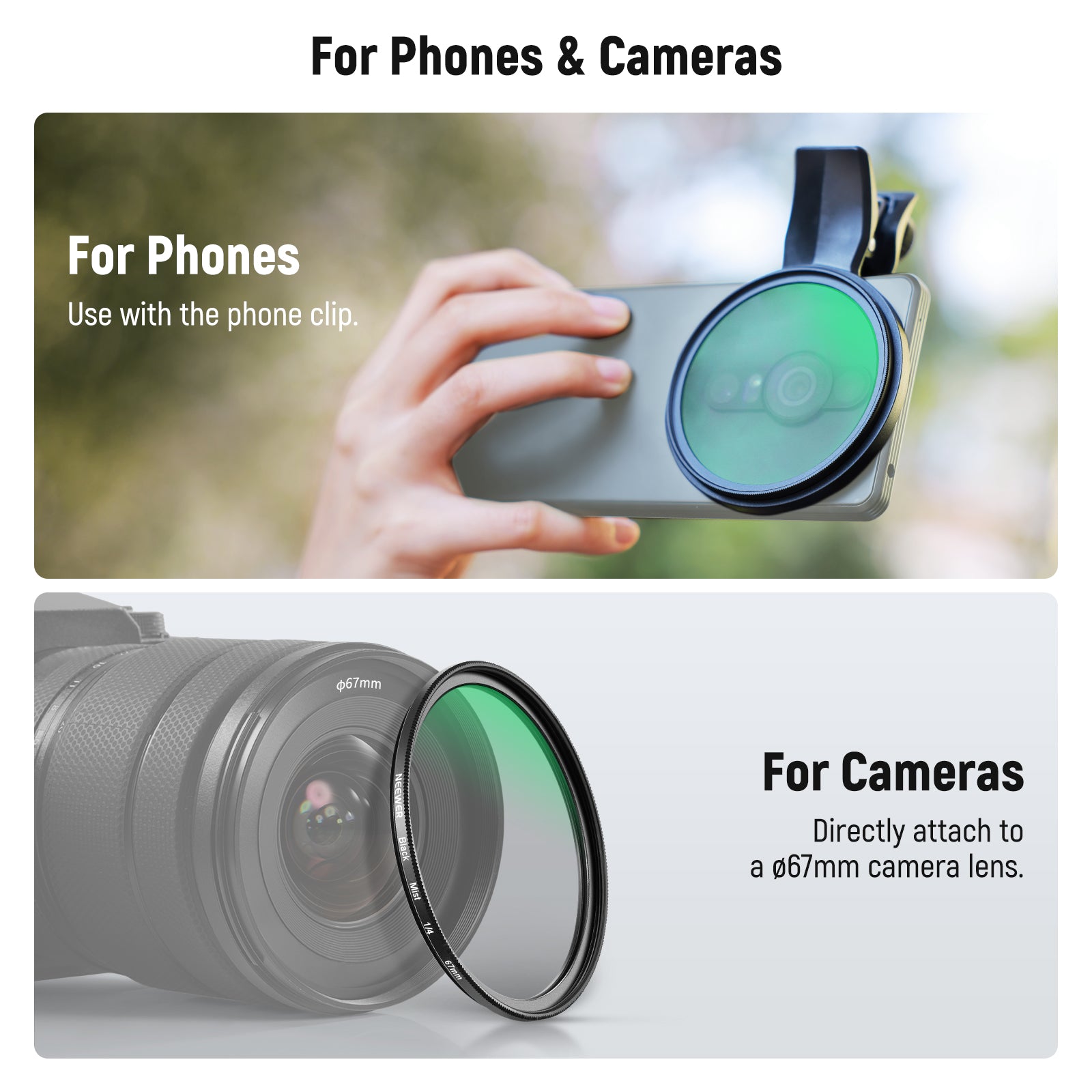 - Versatile Phone Filter Kit- NEEWER 67mm clip on filter kit elevates your mobile photography gear to DSLR camera levels as content creator essential and influencer must have. Ideal for travel, street, landscape, and time lapse photography, as well as weddings and social media. Includes a compact and portable carrying case for easy storage and transport, perfect for cell phone accessories on the go