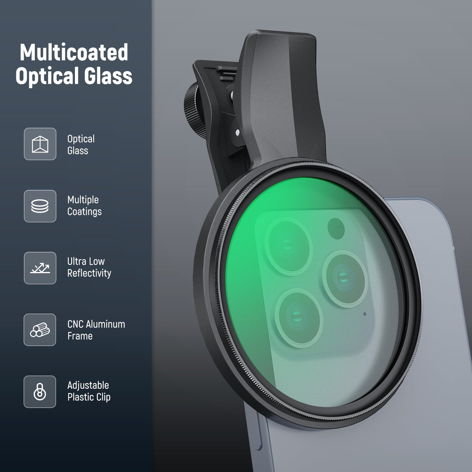 - Secure & Adjustable Clip- The filter clip features an adjustable screw that lets you customize the clip opening and firmly secure the clip during use. Soft and nonslip rubber pads add extra stability and protects the phone from scratches
