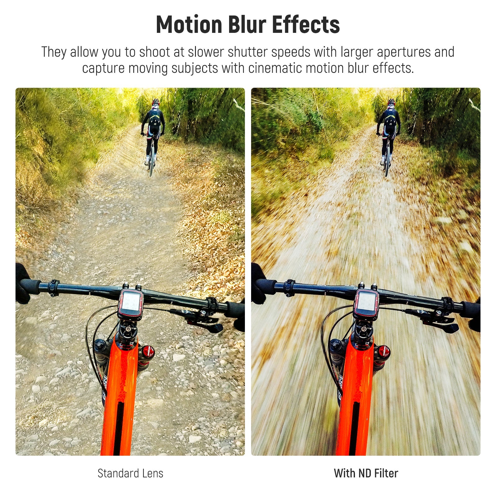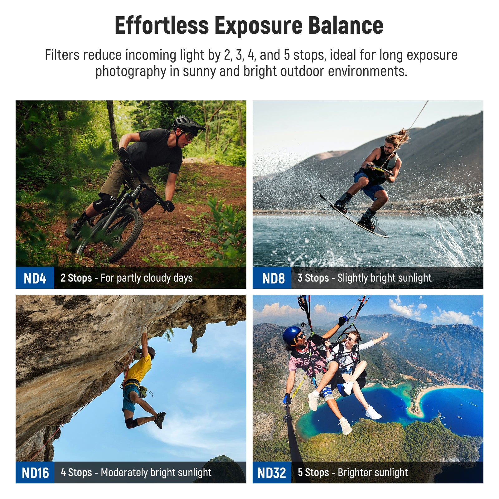 - Effortless Exposure Balance- ND4, ND8, ND16, and ND32 filters reduce the light by 2, 3, 4, and 5 stops respectively, suitable for long exposure photography on sunny and bright days. They allow you to shoot at slower shutter speeds with larger apertures and capture moving subjects with cinematic motion blur effects