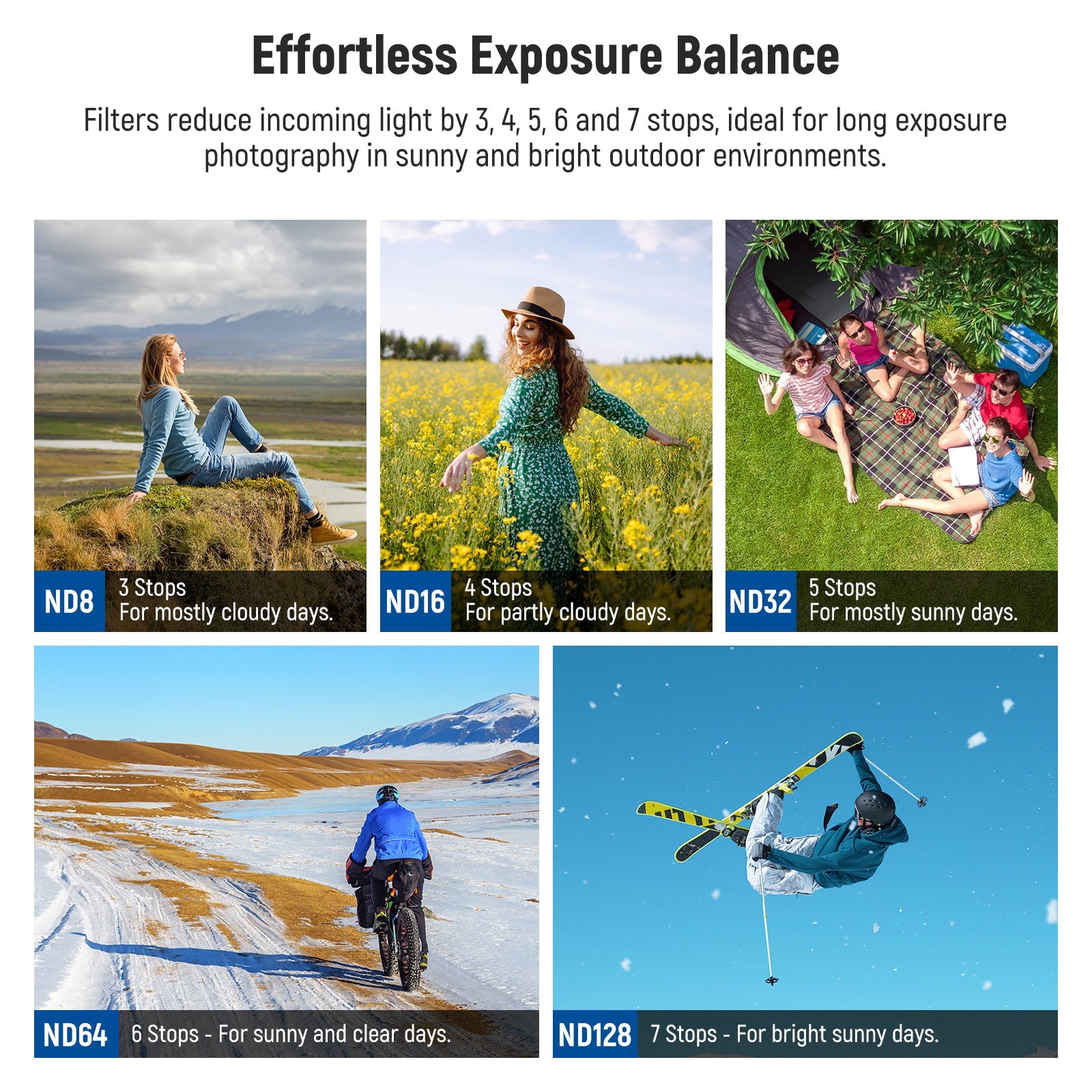 - Effortless Exposure Balance- Five ND filters (ND8, ND16, ND32, ND64, and ND128) reduce light by 3, 4, 5, 6, and 7 stops respectively, suitable for long exposure photography in bright outdoor conditions. They allow you to shoot at slower shutter speeds with larger apertures and capture movements with expressive motion blur effects
