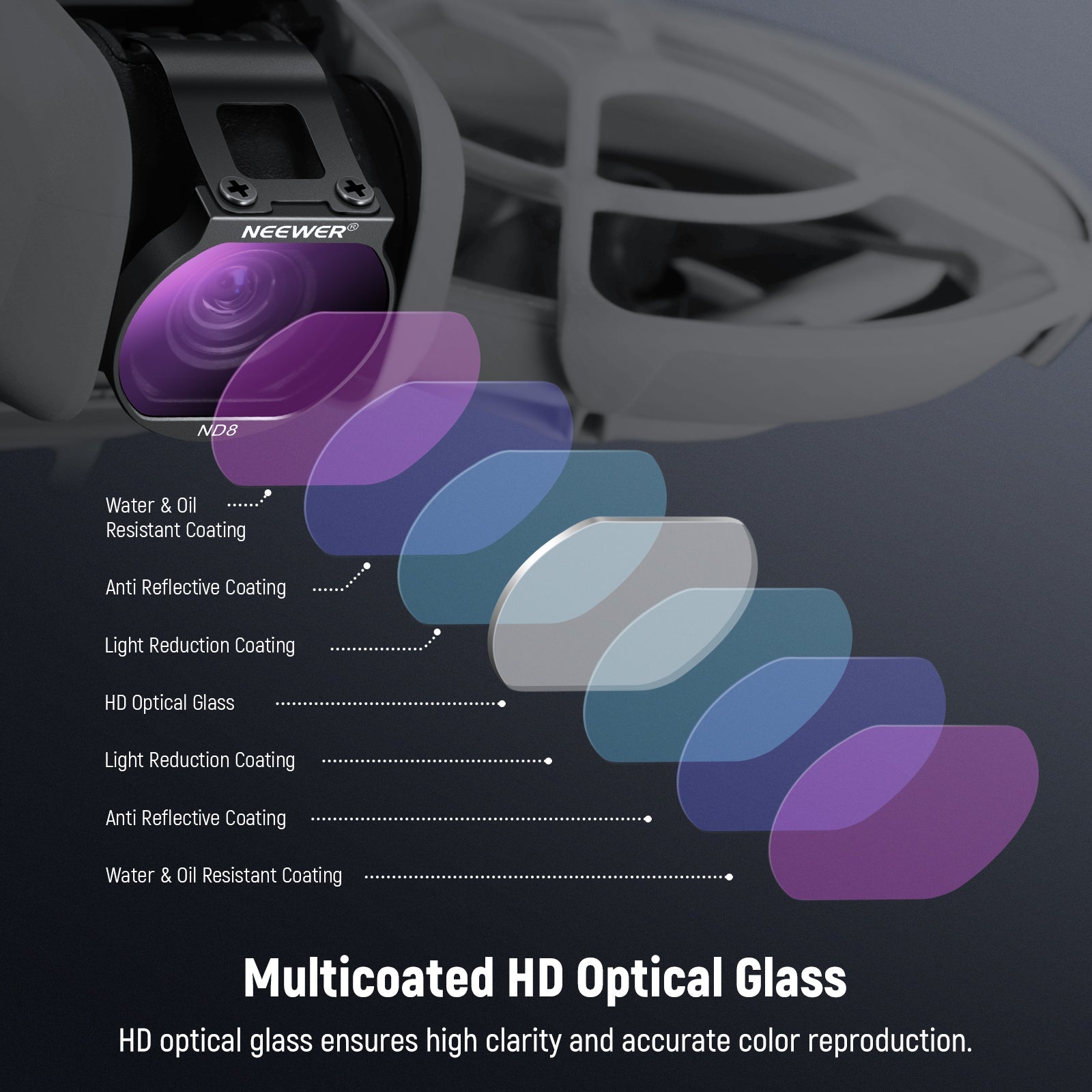 - Multicoated HD Optical Glass- HD optical glass ensures high clarity and accurate color reproduction. Multiple coatings on both sides of the glass are resistant to water, fingerprints, smudge, and scratches, making filters easy to clean