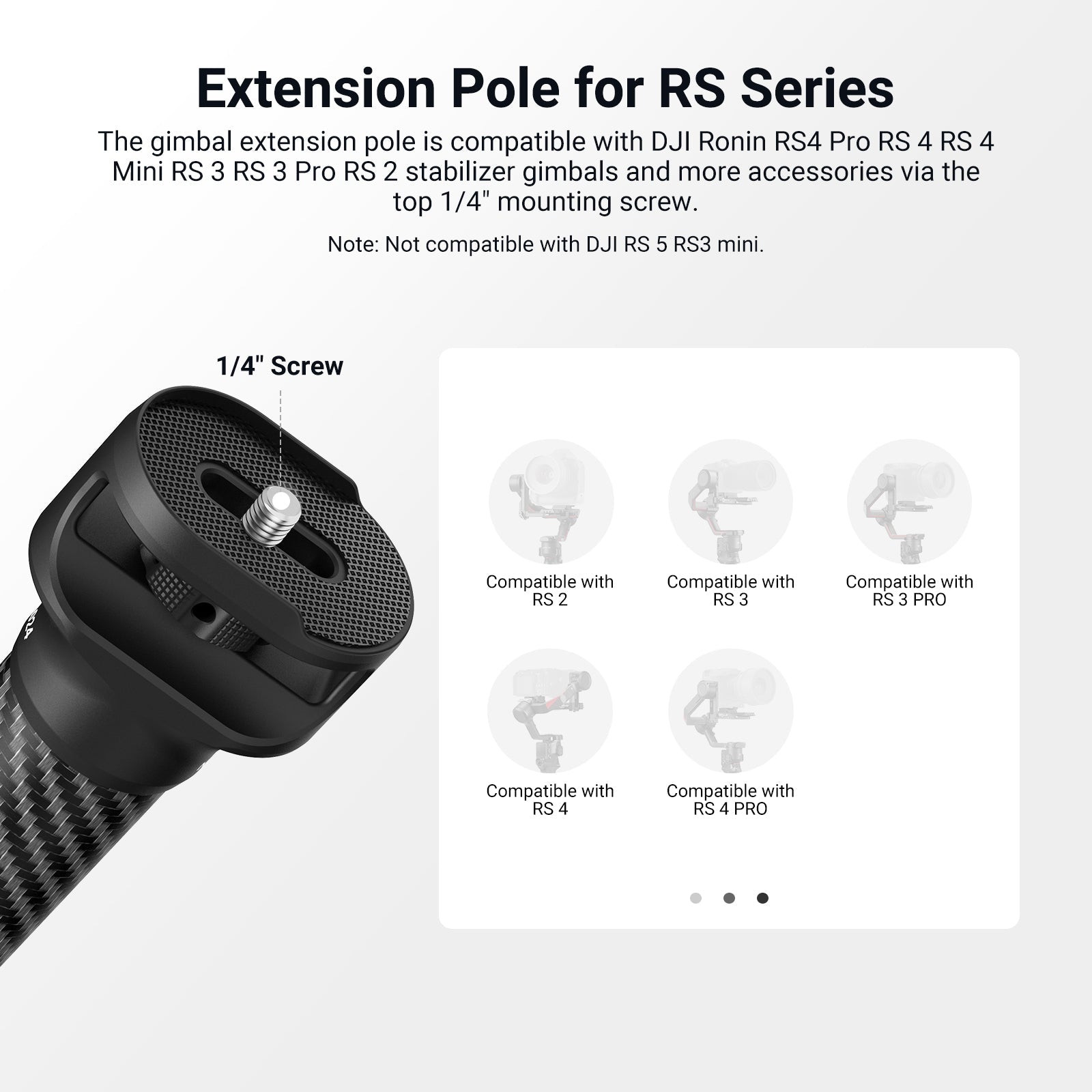 - Extension Pole for RS Series- The gimbal extension pole is compatible with DJI Ronin RS4 Pro RS 4 RS 4 Mini RS 3 RS 3 Pro RS 2 stabilizer gimbals and more accessories via the top 1/4" mounting screw. Note: Not compatible with DJI RS5 RS3 mini