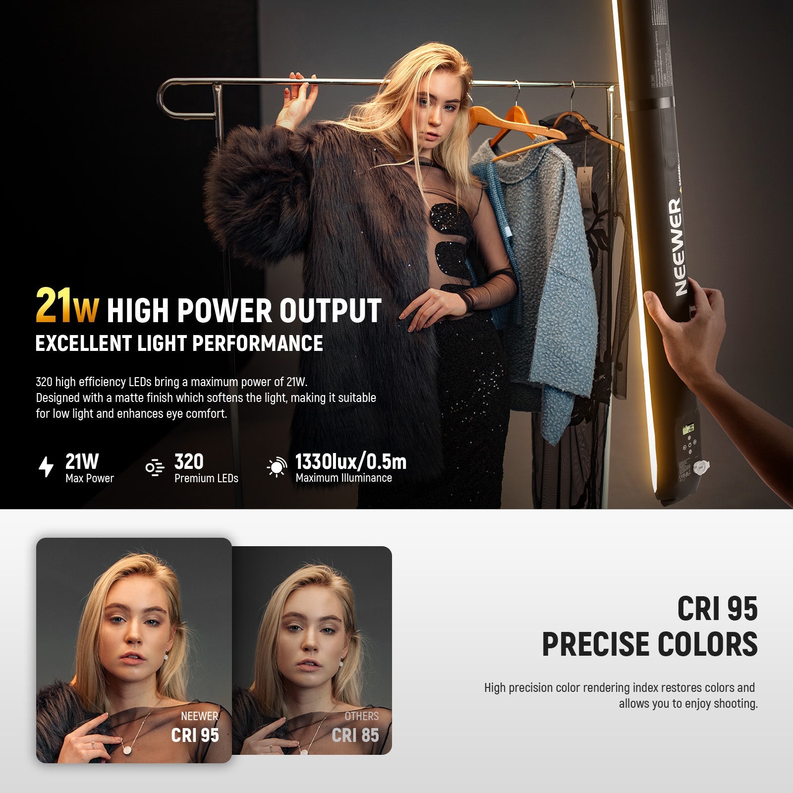 - High Capacity 2500mAh Battery & USB C Charging- The LED tube light has a built in 7.4V 2500mAh 18.5Wh battery that keeps the light running for up to 50 minutes at full brightness, serving as a reliable photography lighting gadget for you to capture beautiful moments and film dynamic vlogs. Effortlessly recharged to full within 120min using the included USB C cable with portable chargers (NOT included), enabling extended shooting sessions on the go