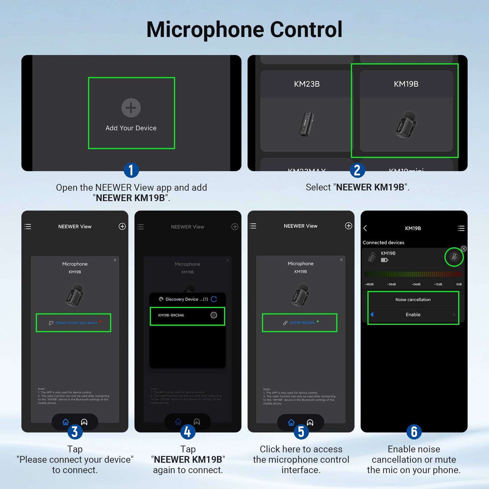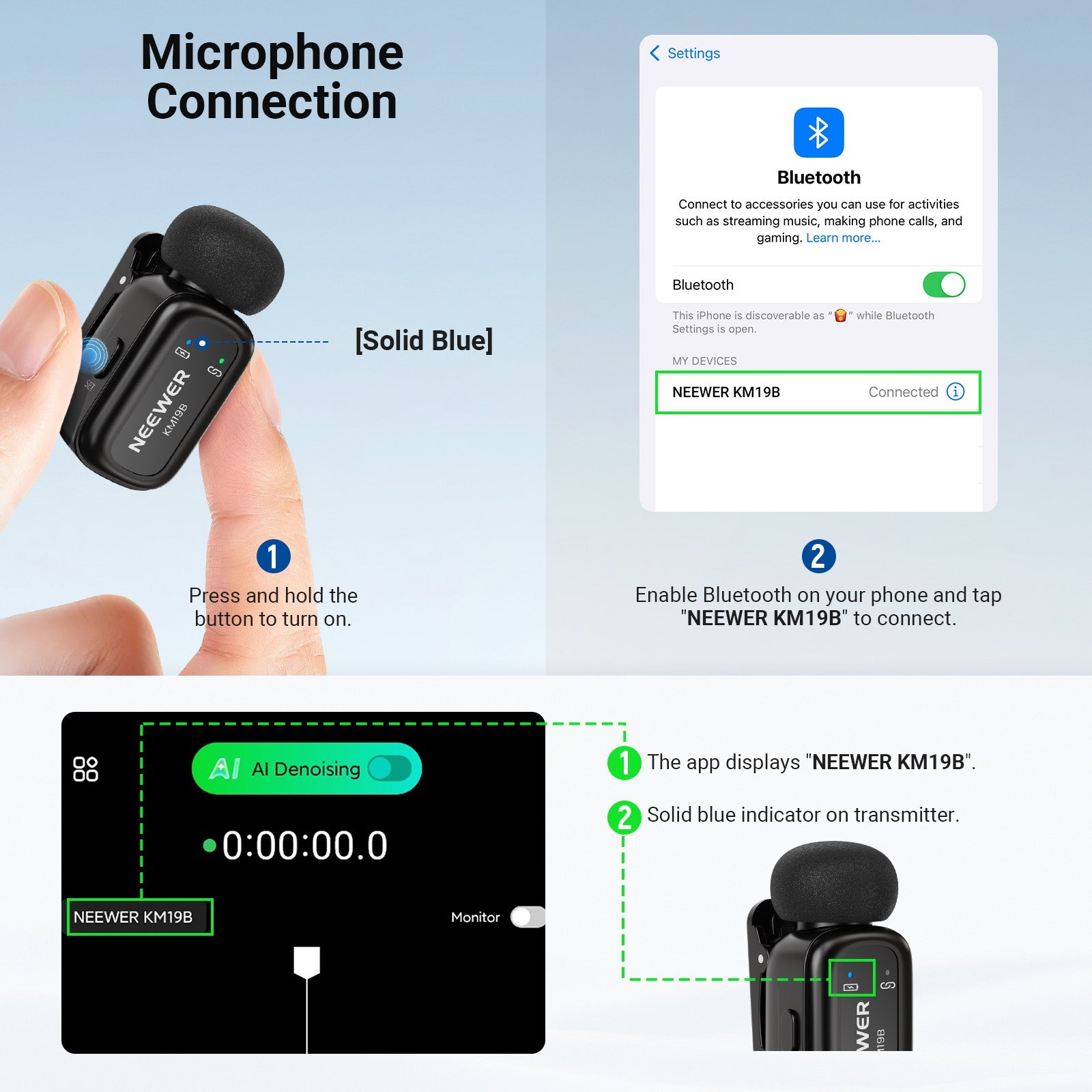 - Easy Wireless Connection- Press and hold the power button to turn on the transmitter (flashing blue light). Then, search for "KM19B" in your phone to connect. Once connected, open the NEEWER View app and ensure that "KM19B" appears in the top-left corner. Use the app's built in recorder to capture audio, or run the app in the background when recording with other apps