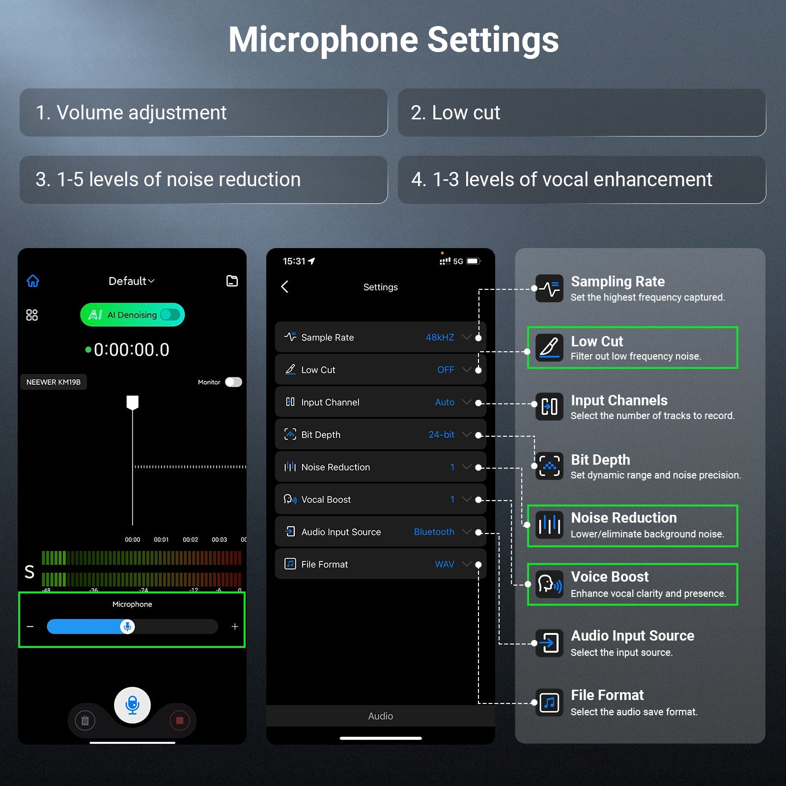 - Two Way App Control- Download NEEWER Mic app and enjoy two way control from phone or microphones. Advanced functions in the app include 3 level vocal enhancement, low cut, and 5 level noise cancellation
