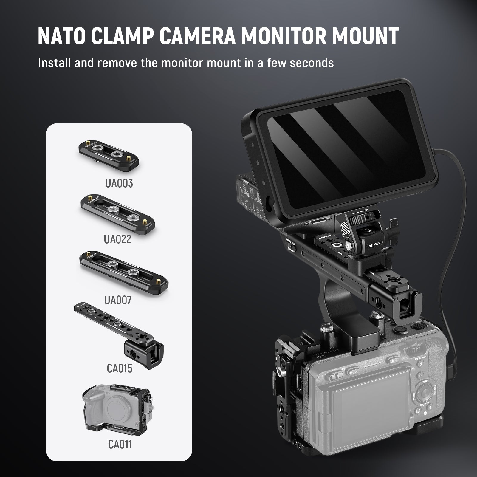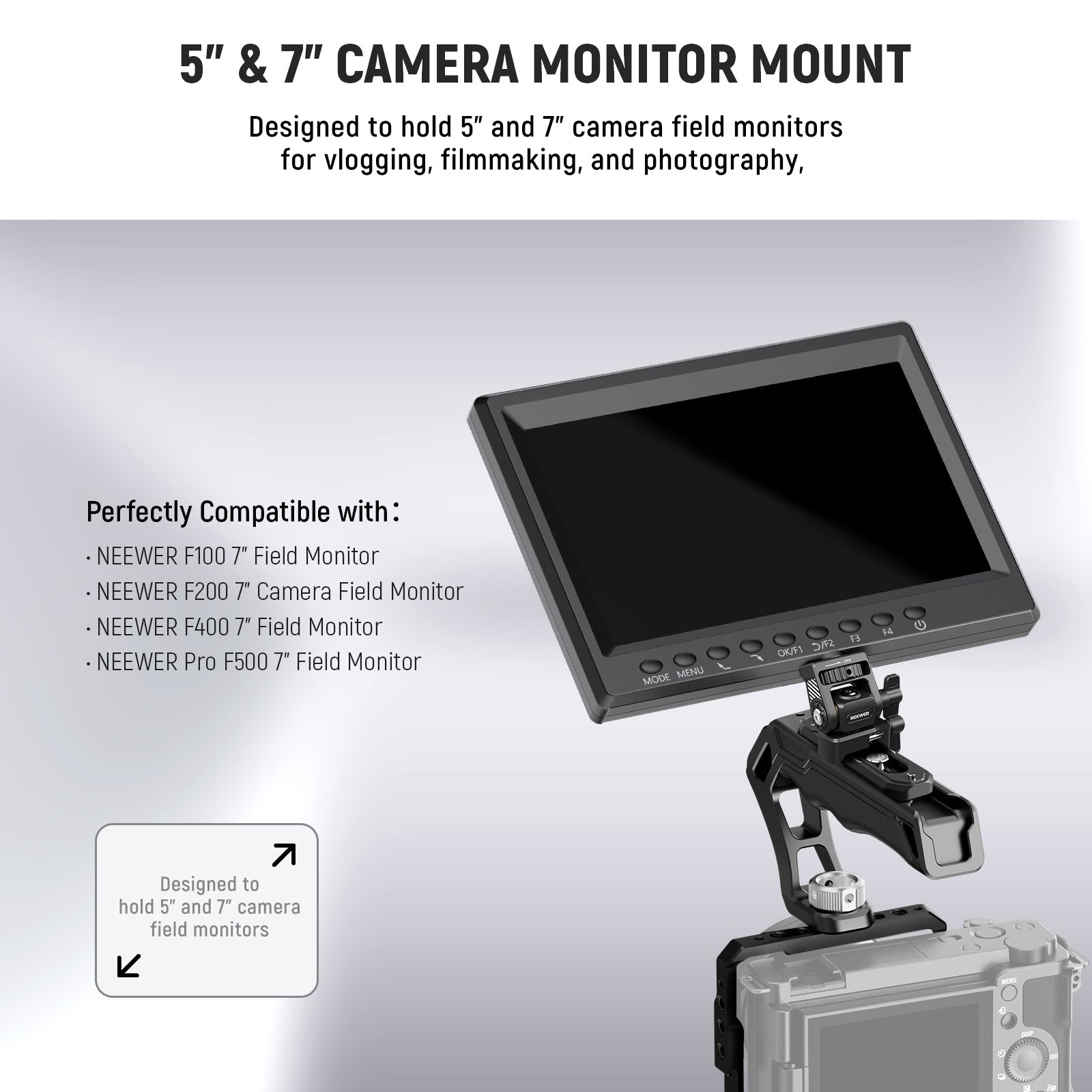 - For 5" & 7" Camera Field Monitors- Designed for 5" and 7" camera field monitors, this monitor mount with a NATO clamp is compatible with SmallRig and NEEWER camera cages compatible with Canon Sony Nikon Fujifilm Fuji cameras, video rigs, top handle accessories, side handles, gimbal sling handles, and camera hot shoes, perfect for vlogging, filmmaking, and photography