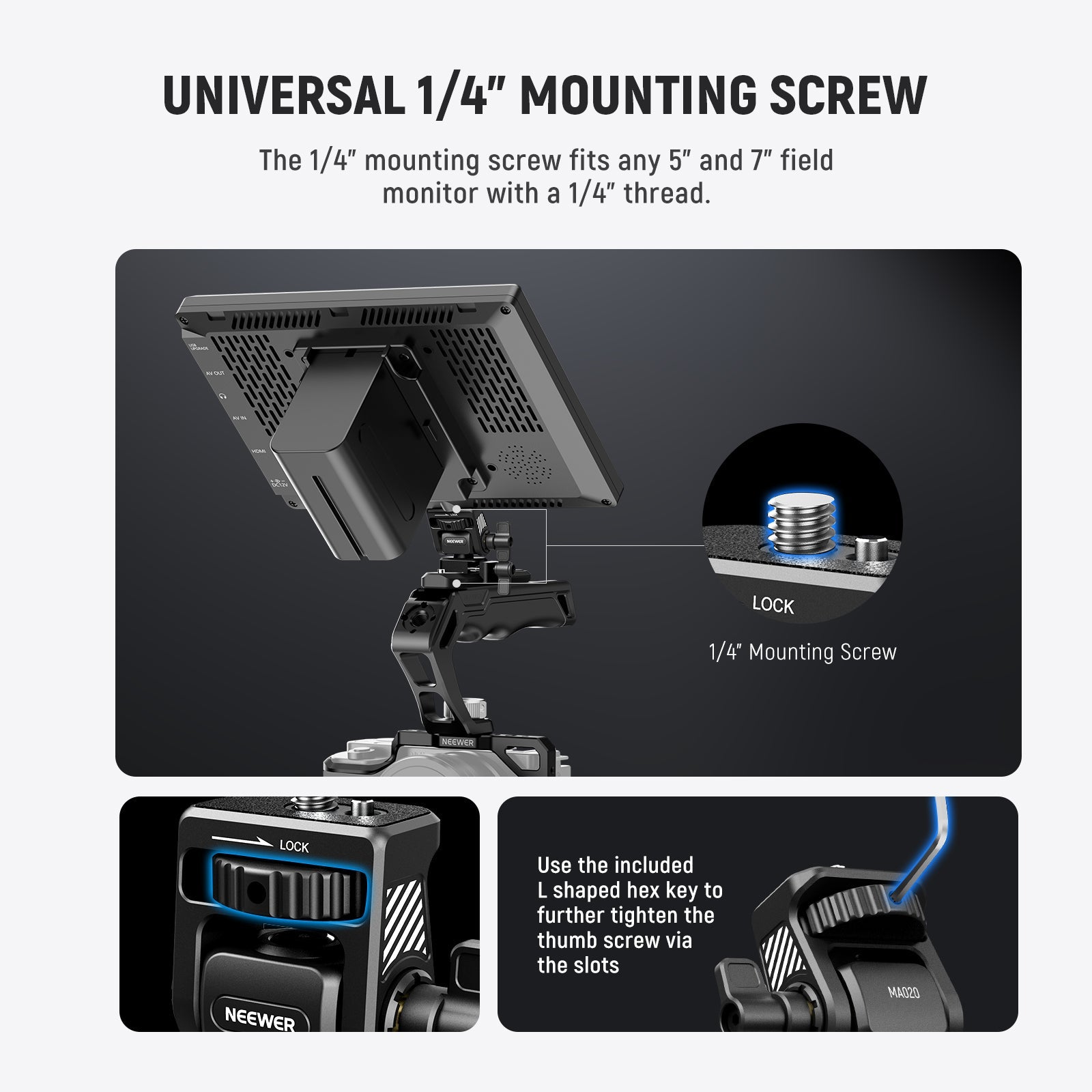 - Universal 1/4" Mounting Screw- The 1/4" mounting screw fits any 5" and 7" field monitor with a 1/4" thread. To fasten the screw, tighten the thumb wheel by hand or use the included hex key for extra security